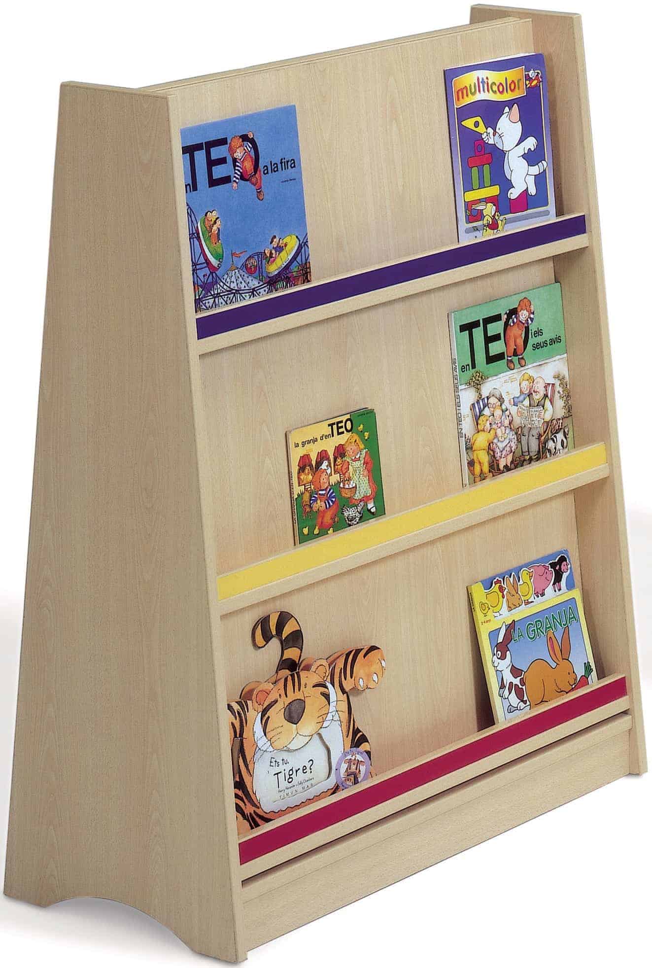 Expositor libros infantil biblioteca accesible dos caras. Una expositor de libros y otra estantes. Con ruedas