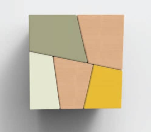 Colgador mural de madera de haya pintada de diferentes colores. 5 piezas irregulares generadas a partir de un único bloque. La manera más original de colgar en una pared tus prendas de ropa. Su modularidad permite la distribución al gusto de cada uno.