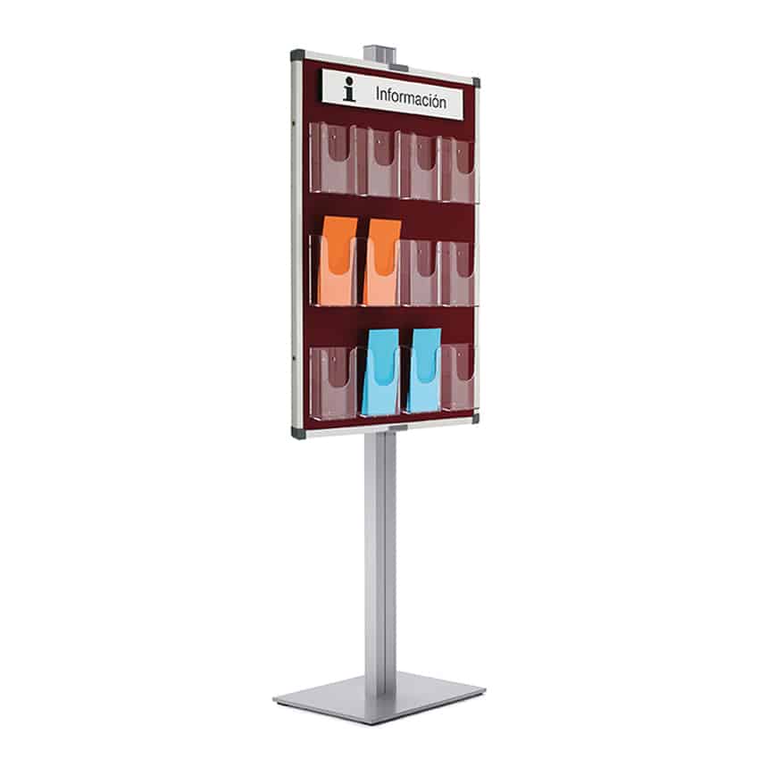 Expositor mural fabricado en melamina con cajetines de metacrilato. Base metálica cuadrada gris. Expositor con soporte «Quadra» disponible en 3 tamaños y 2 formatos de portafolletos DIN A4 y 1/3 DIN A4.