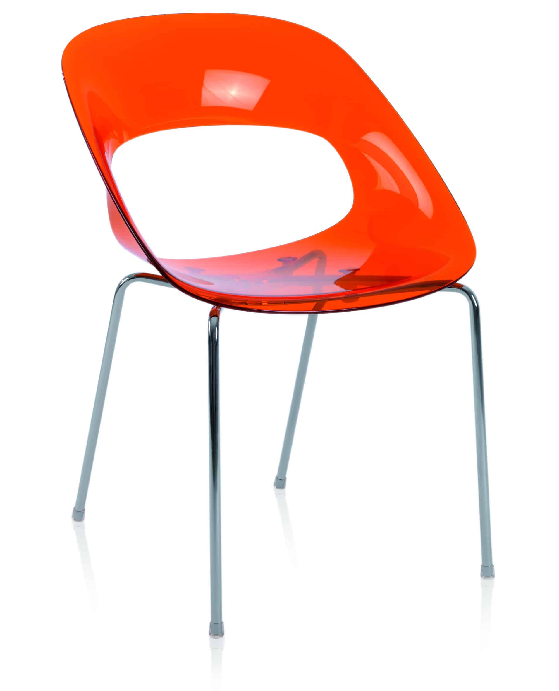 Estructura de 4 apopyos de tubo de acero cromado. Asiento de inyección de policarbonato translucido u opaco 100% reciclable anti UV.