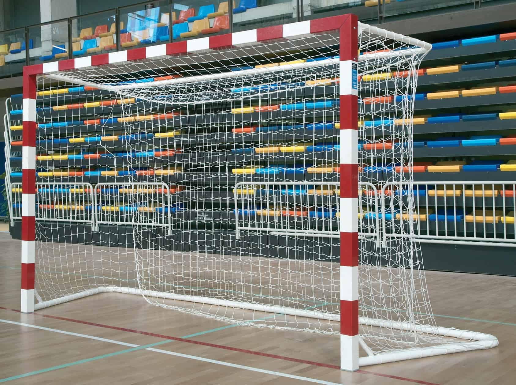 Fabricadas conforme a la norma UNE-EN 749. Postes y largueros fabricados en aluminio, metal pintado en blanco y rojo (otros colores bajo presupuesto). La unión de los postes y largueros en el modelo de aluminio se realiza mediante escuadras metálicas interiores de 60 x 40 mm. En el modelo de perfil metálico el marco se suministra soldado. Los marcos son de sección cuadrada de 80 x 80 mm con los cantos redondeados o de sección redonda de 90 mm. Dimensiones 3,00 x 2,00 x 1 m. Arquillos fijos o abatibles provistos de orificios laterales para ser anclada y evitar su vuelco en perfil de acero redondo cincado de 32 mm. En el modelo abatible a pared, el abatimiento está fabricado en tubo cuadrado de 45 x 45 x 2 mm con ruedas para facilitar el plegado a la pared. Ganchos de PVC para fijación de la red al marco. Precio por juego de 2 unidades, sin redes.