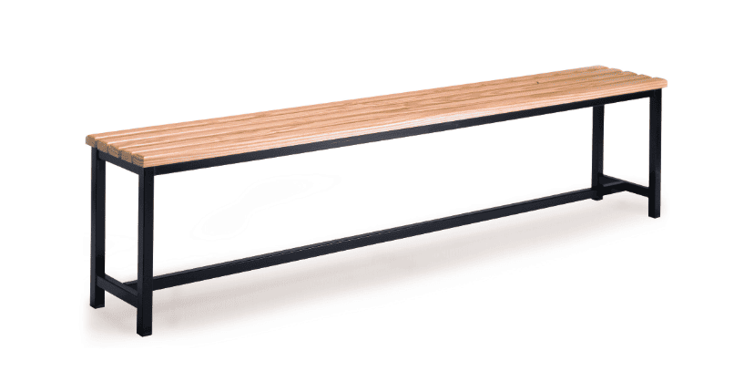 Banco de vestuario con estructura de tubo de acero y listones de madera de pino. Disponible en medidas 150 x 30cm y 200 x 30cm.