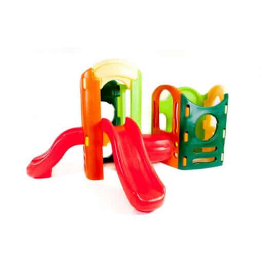 El Gimnasio 8 en incluye 2 toboganes, un tobogán extra largo y uno más corto y suave, una escalera robusta, dos plataformas y un túnel.