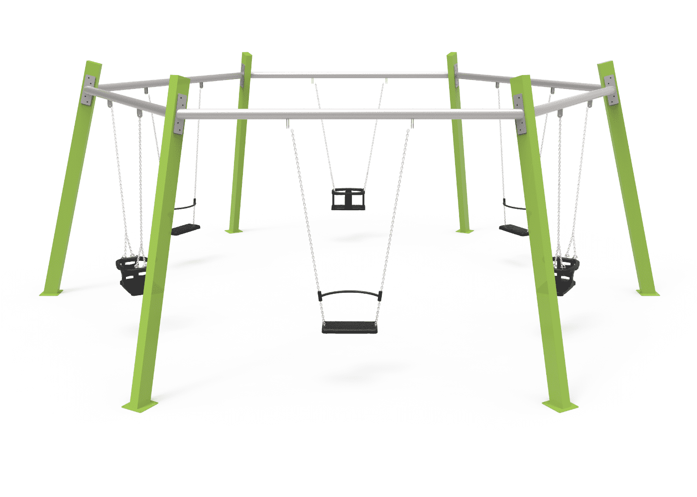 Columpio infantil de 6 puestos estándar, combinados o de cuna. Están compuestos de estructura metálica – postes de 140x80mm galvanizados y tornillería electro galvanizada y de acero inoxidable 8.8 DIN267, AISI-304. Ninguno de los materiales necesita tratamiento especial.
