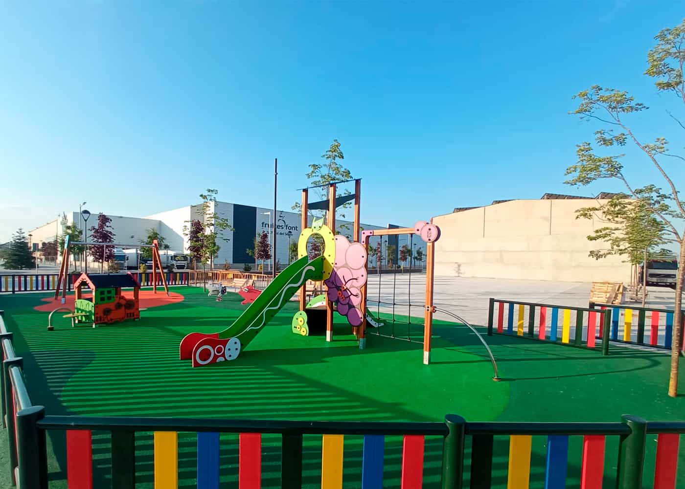 El conjunto está hecho de madera laminada, paneles ecoplay de polietileno de alta densidad, plataformas fenólicas, redes de cuerda armada antivandálica, piezas y tornillería de acero inoxidable AISI-304.