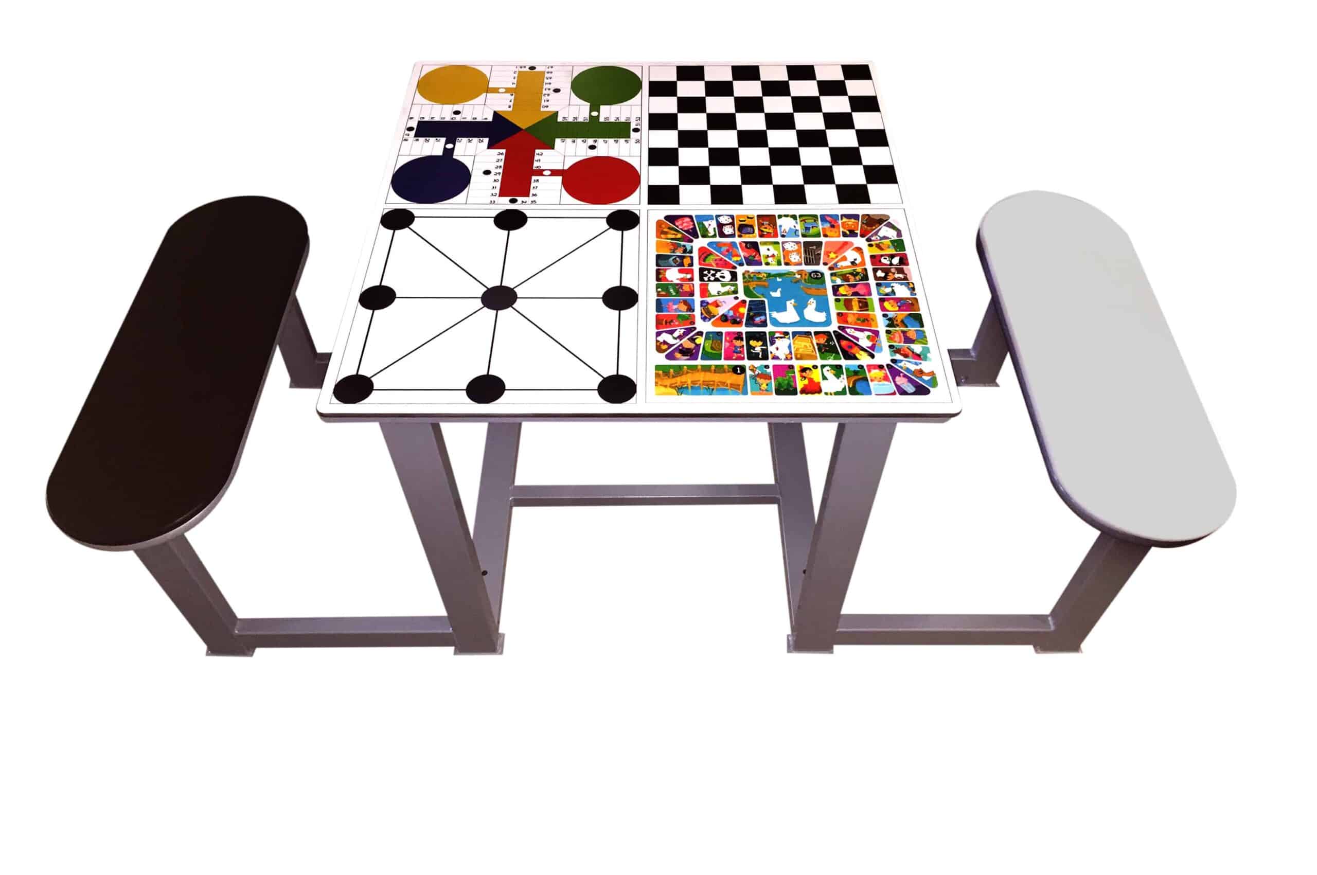 Mesa antivandálica. Dotada de dos bancos fabricados en polietileno. 4 juegos impresos digitalmente en tablero compacto.