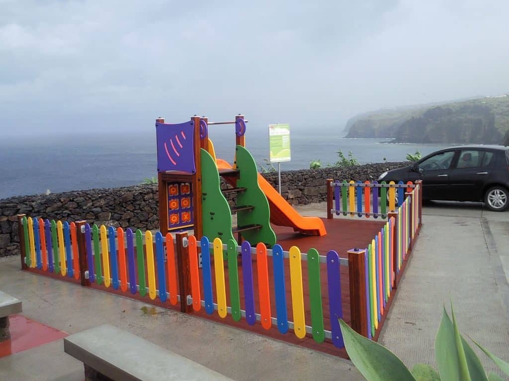 Fabricado con madera de pino laminada tratada en autoclave, plataformas en madera contrachapada fenólica tratada, tobogán en polietileno de alta densidad, tornillería y tubos en acero inoxidable.