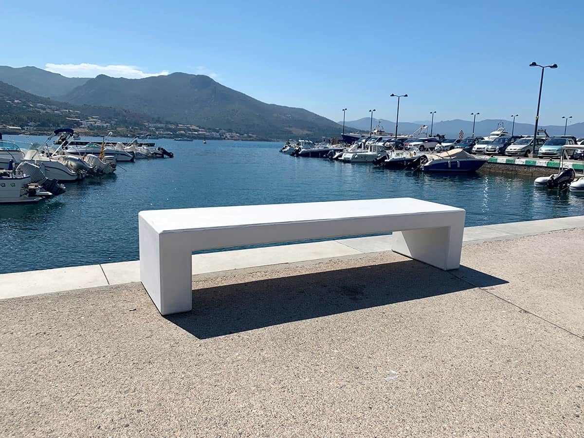 Descripción: Banco Zeus de hormigón prefabricado hidrofugado de color blanco con armadura de acero.
