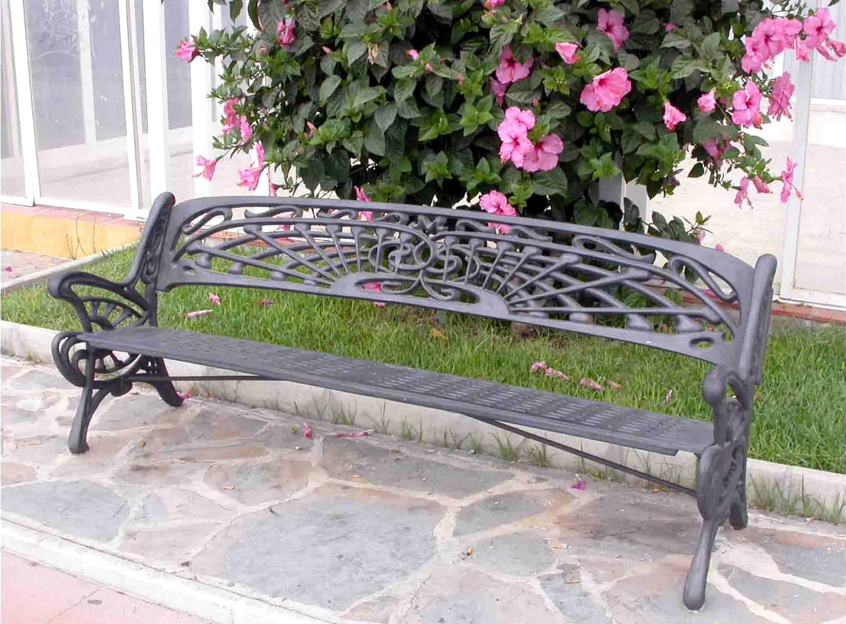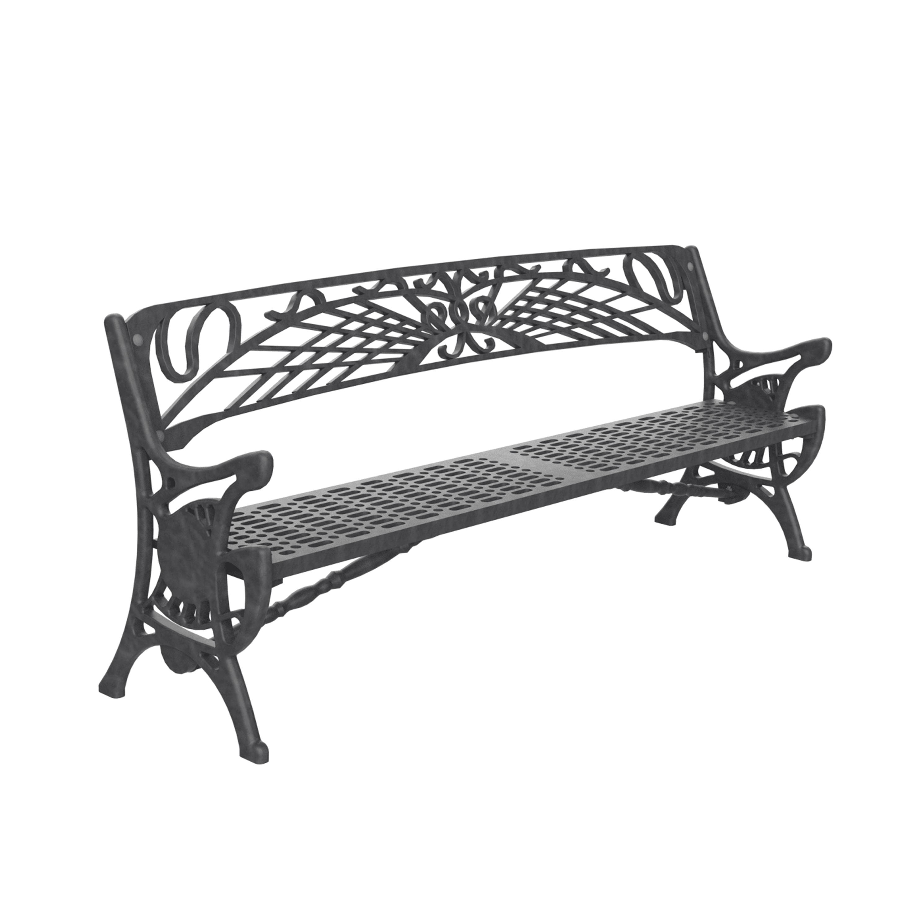 Banco para parques y espacios exteriores. Hecho completamente en fundición. Capa de pintura antioxidante y capa de pintura de oxiron negro. Largo 200 cm.