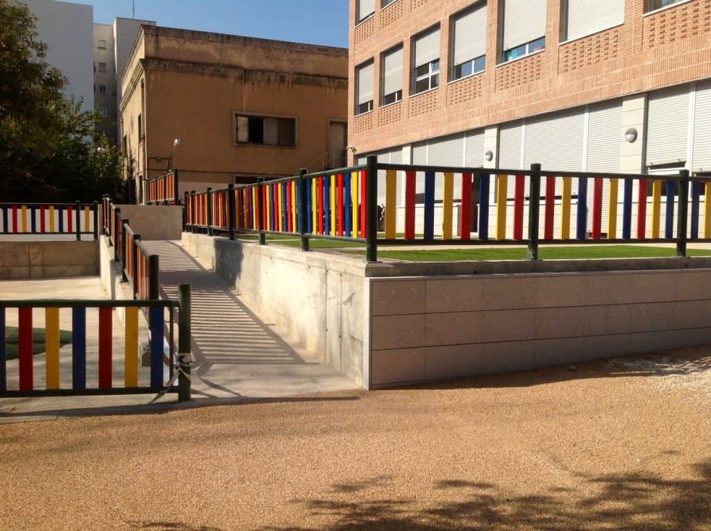 Vallas metálicas de colores para parques infantiles de exterior homologadas, patentadas y certificadas para cerramiento de áreas infantiles. Dimensiones exteriores totales del vallado con dos postes 2100 x 1200 x 100 mm incluido anclajes.
