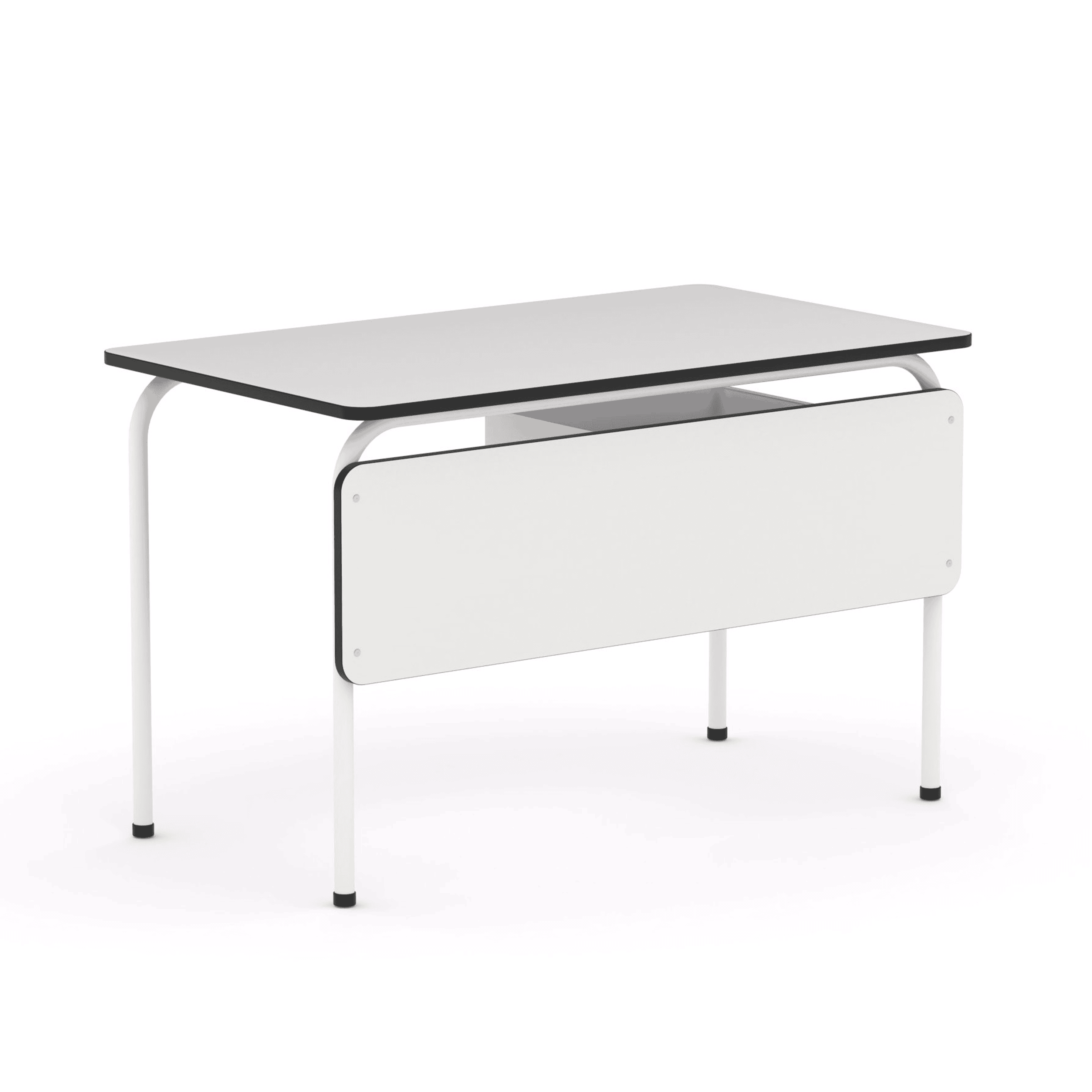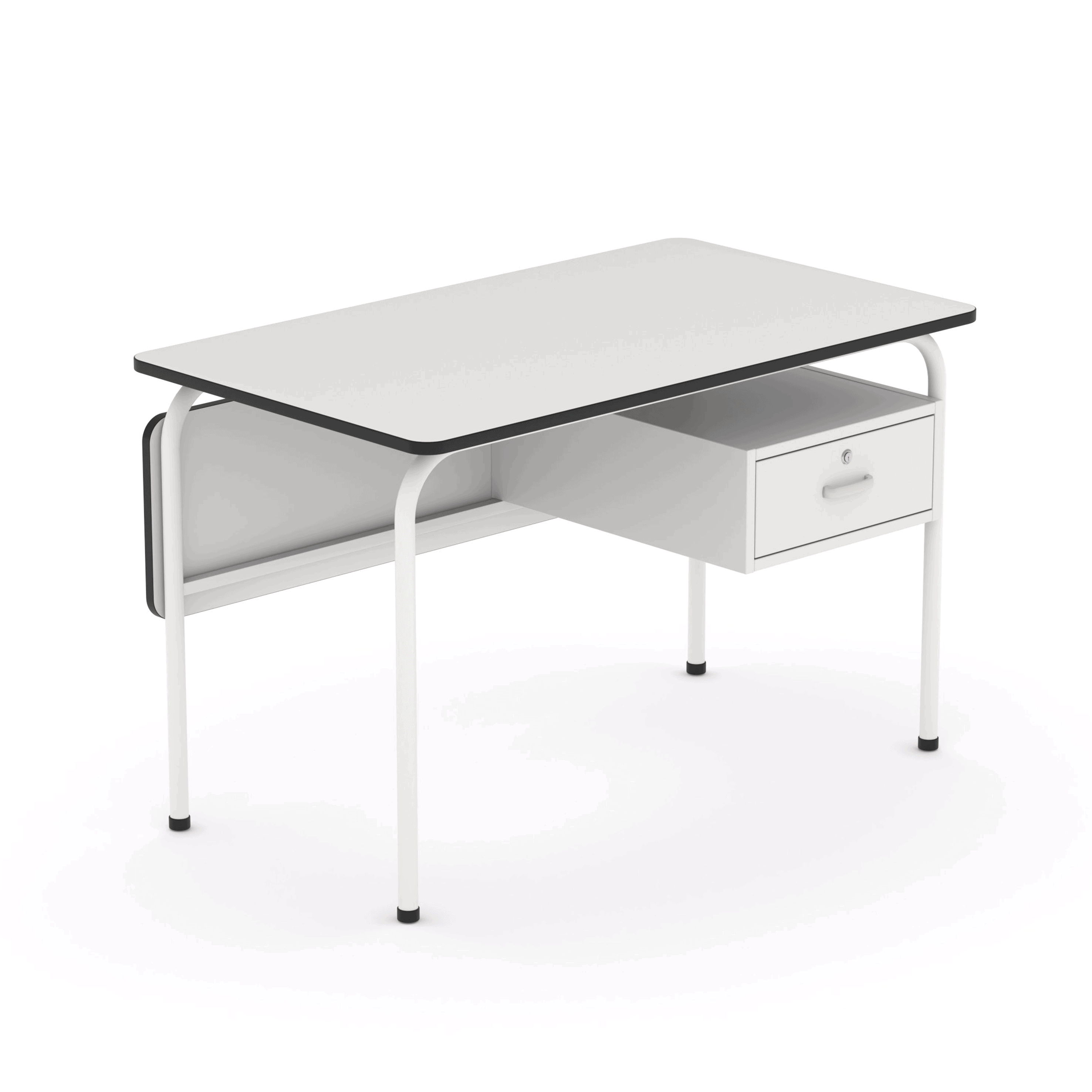 Mesa escolar de profesor con faldón y un cajón con cerradura. Estructura de tubo de acero Ø30 x 1,5mm. Pintado en epoxi y tapa en melamina con cantos en PVC 2mm. Medidas: 1200 x 700.