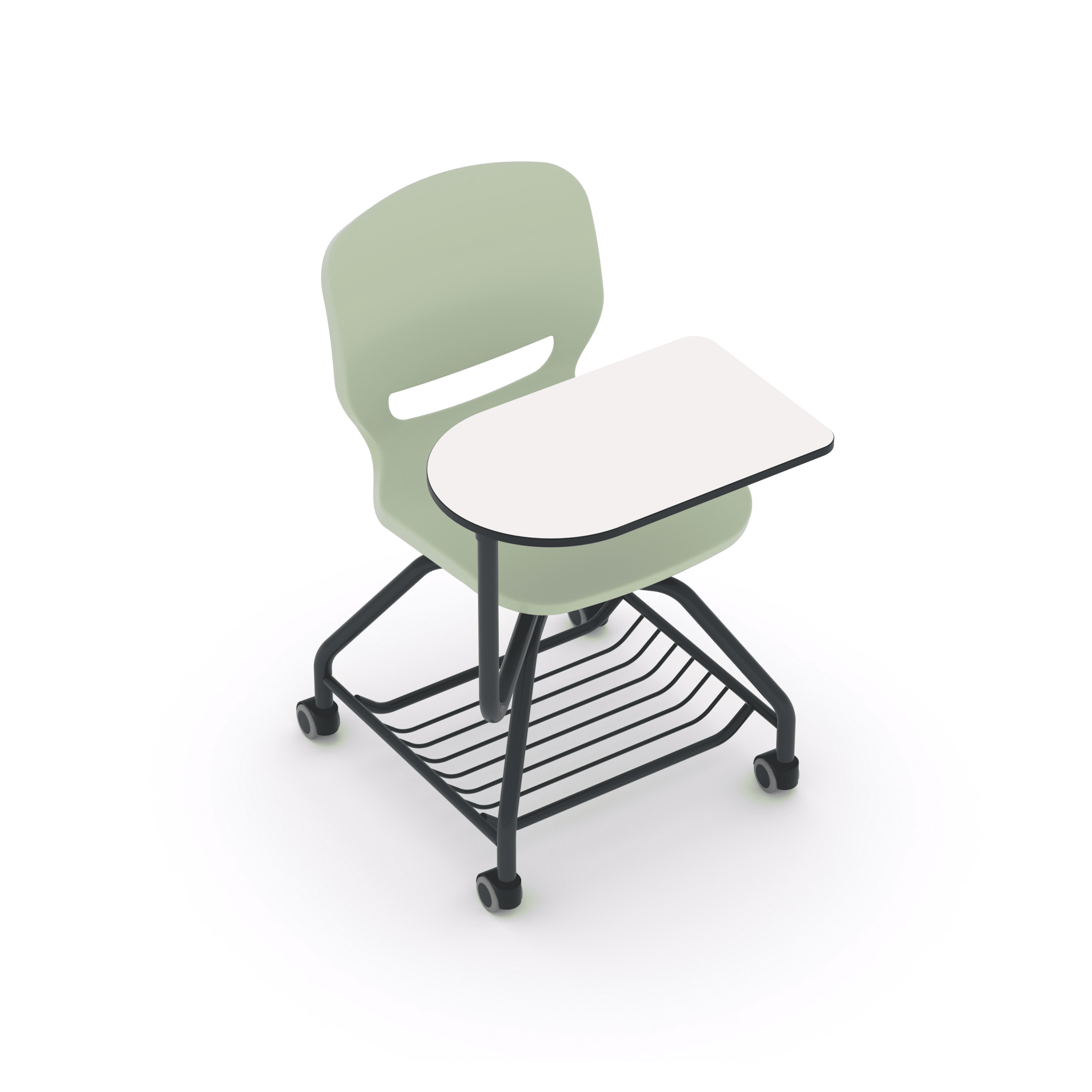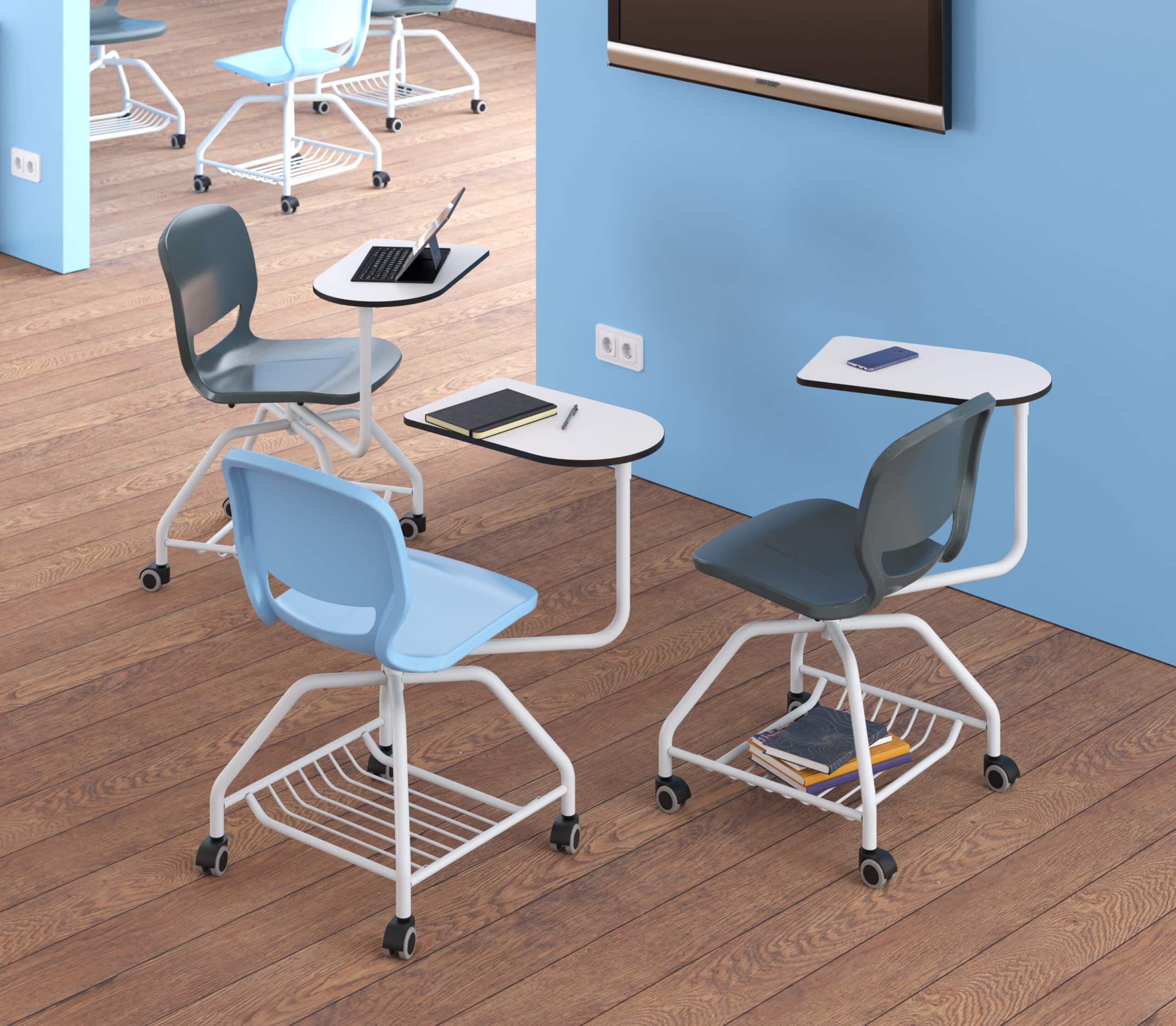 Silla de carcasa de polipropileno con pala giratoria de compacmel. Estructura metálica con parrilla inferior y ruedas de poliamida. La pala, apta para escribir a derecha e izquierda, mide 500 x 300 mm. Disponible en T6.