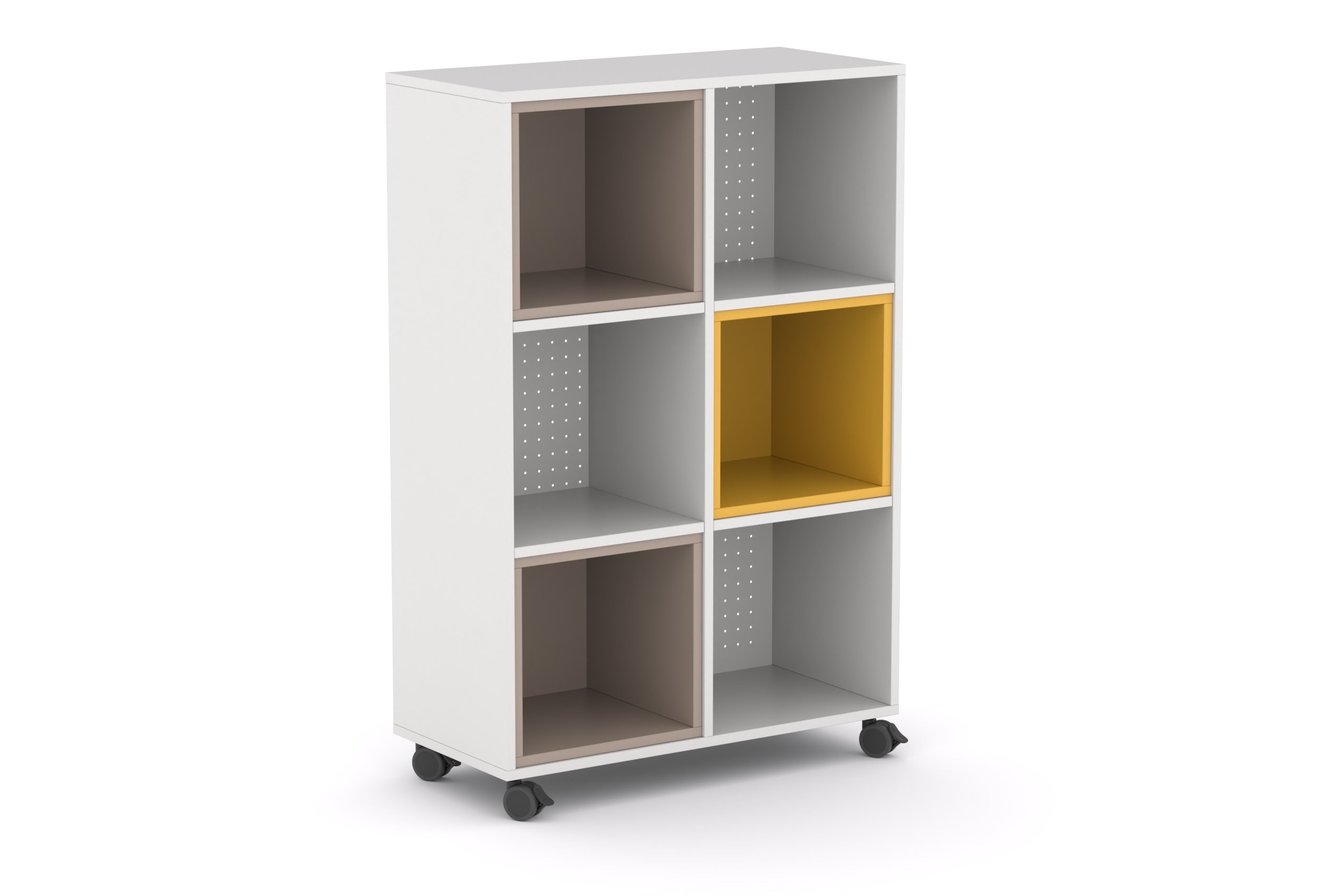 Armarios móvil recto y adaptable a otros modelos curvos, permiten ser combinados con puffs soft seating, módulos interiores y gradas con o sin puertas. Fabricado en melamina de 19mm con trasera de chapa metálica perforada. Ruedas de H=80 mm con freno y alta capacidad de carga. Incorpora de forma voluntario módulos interiores (abiertos o cerrados) en melamina, llevando el modelo con puerta un tirador tipo uñero. Bisagras superacodadas anti atrapamiento con amortiguación. Cerraduras opcionales.