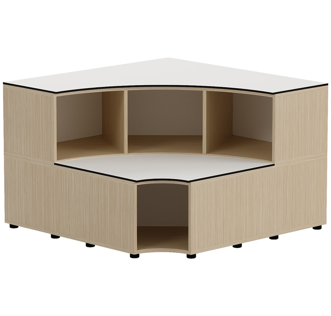 Grada de esquina fabricada en cuerpo de melamina acabado madera nórdica y trasera y asiento en melamina blanca.