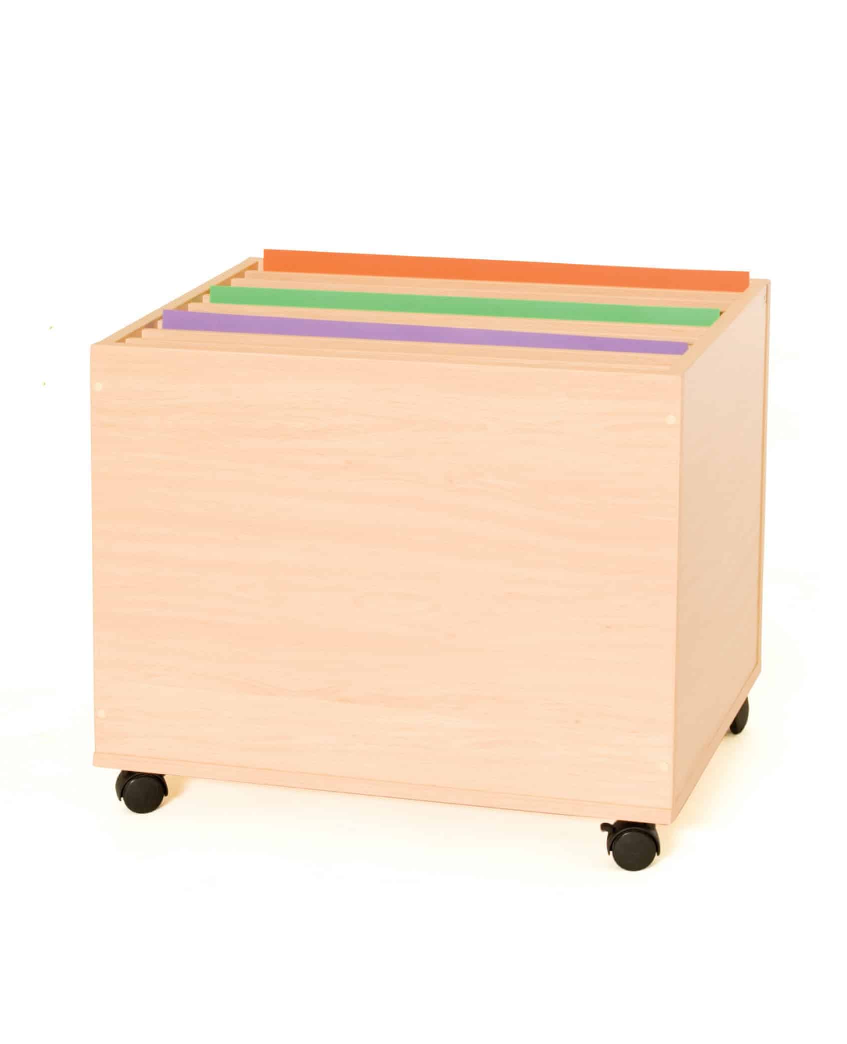 Archivador de cartulinas vertical con 10 huecos Fabricado con tableros de 19 mm. de espesor y separadores intermedios de 10 mm.. Cantos de PVC de 2 mm., acabado por las dos caras. Con ruedas