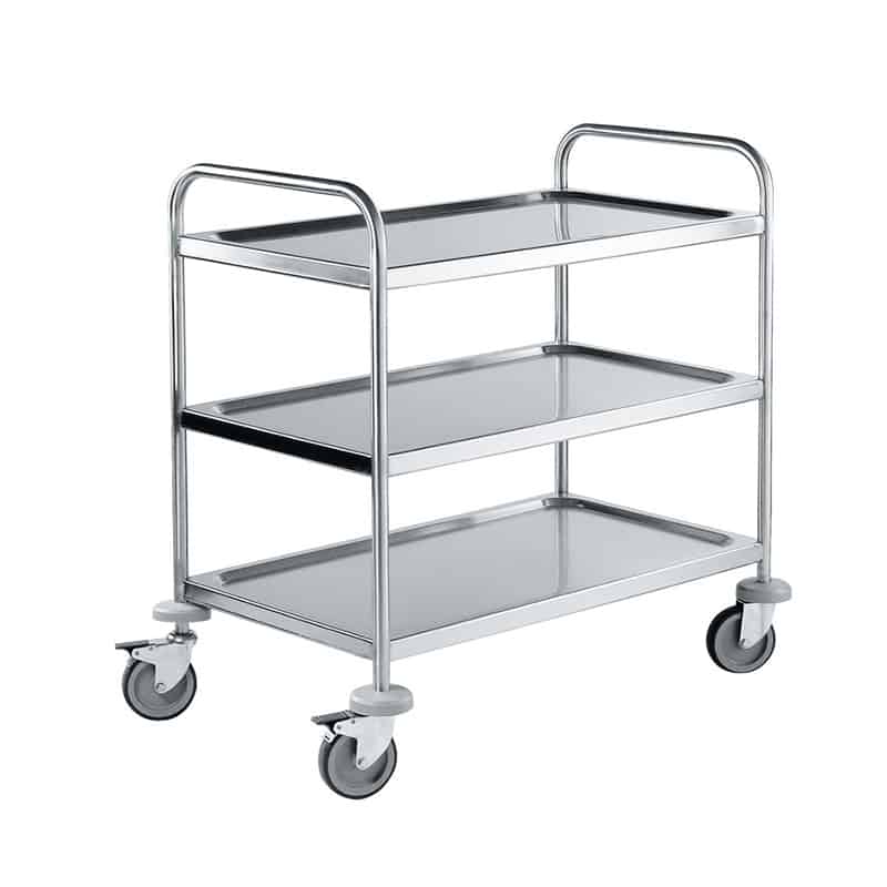 Carro servicio para transporte de platos, vasos, etc. Fabricado en acero inoxidable. Dotado de 4 ruedas pivotantes (2 con freno). Disponible con dos y con tres estantes.