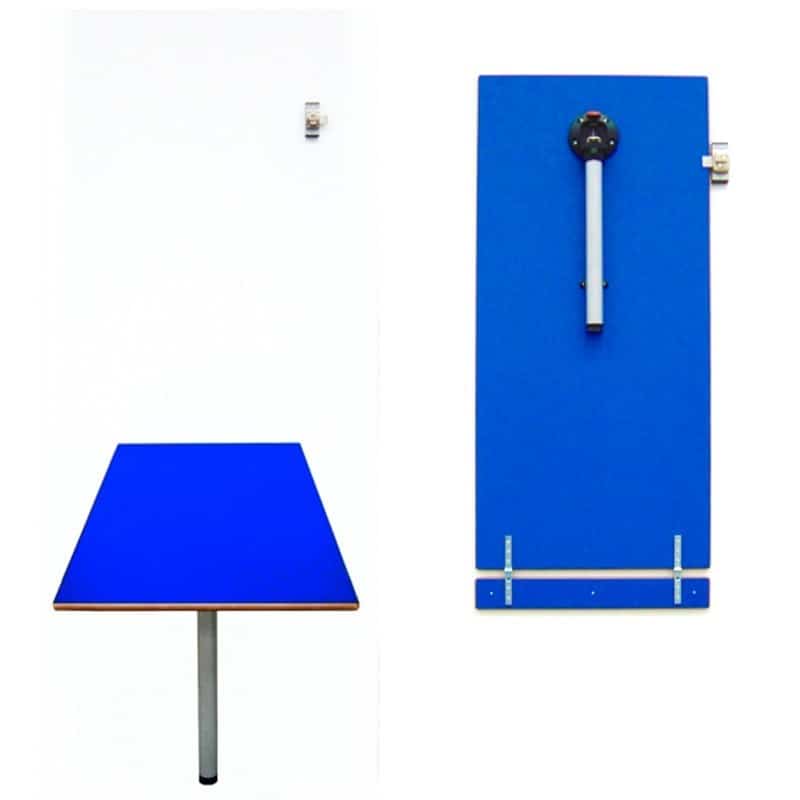 Mesa mural abatible infantil. Sobre en DM estratificado. Estructura de tubo de acero pintado en epoxy blanco, verde o plata.