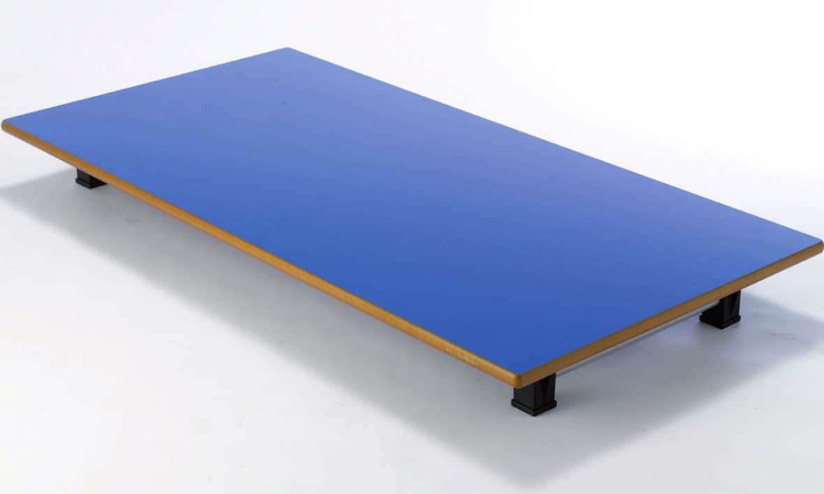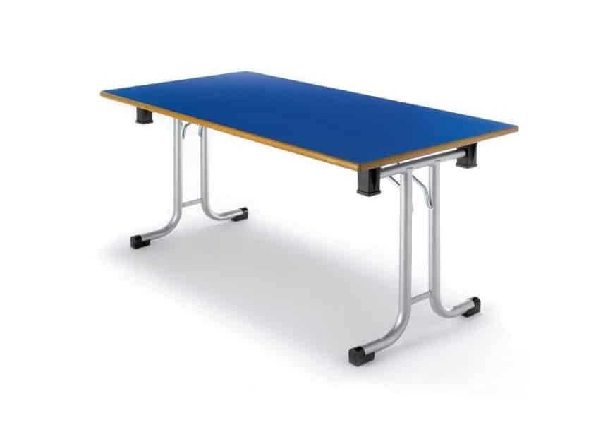 Mesa para comedor con patas plegable de distintas alturas para niños y adultos. De 18mm de espesor y acabado estratificado con cantos redondeados y barnizados. Estructura plegable de tubo de acero pintado.