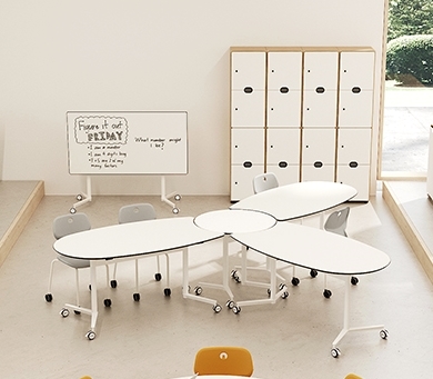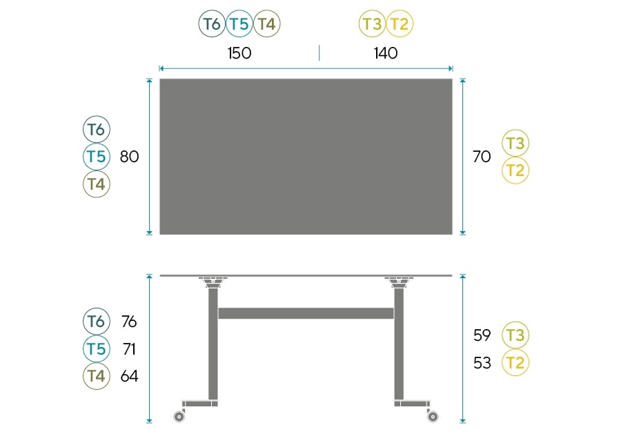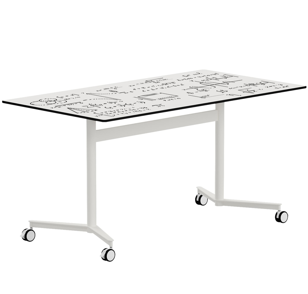 Mesa abatible con ruedas y freno, fabricada con estructura metálica soldada que le proporciona una gran solidez, pintada en epoxy blanco microtexturado RAL 9010. Tablero en compacto rotulable de 19 mm canteada en PVC negro. Disponible en 5 alturas T2-T3-T4-T5-T6.