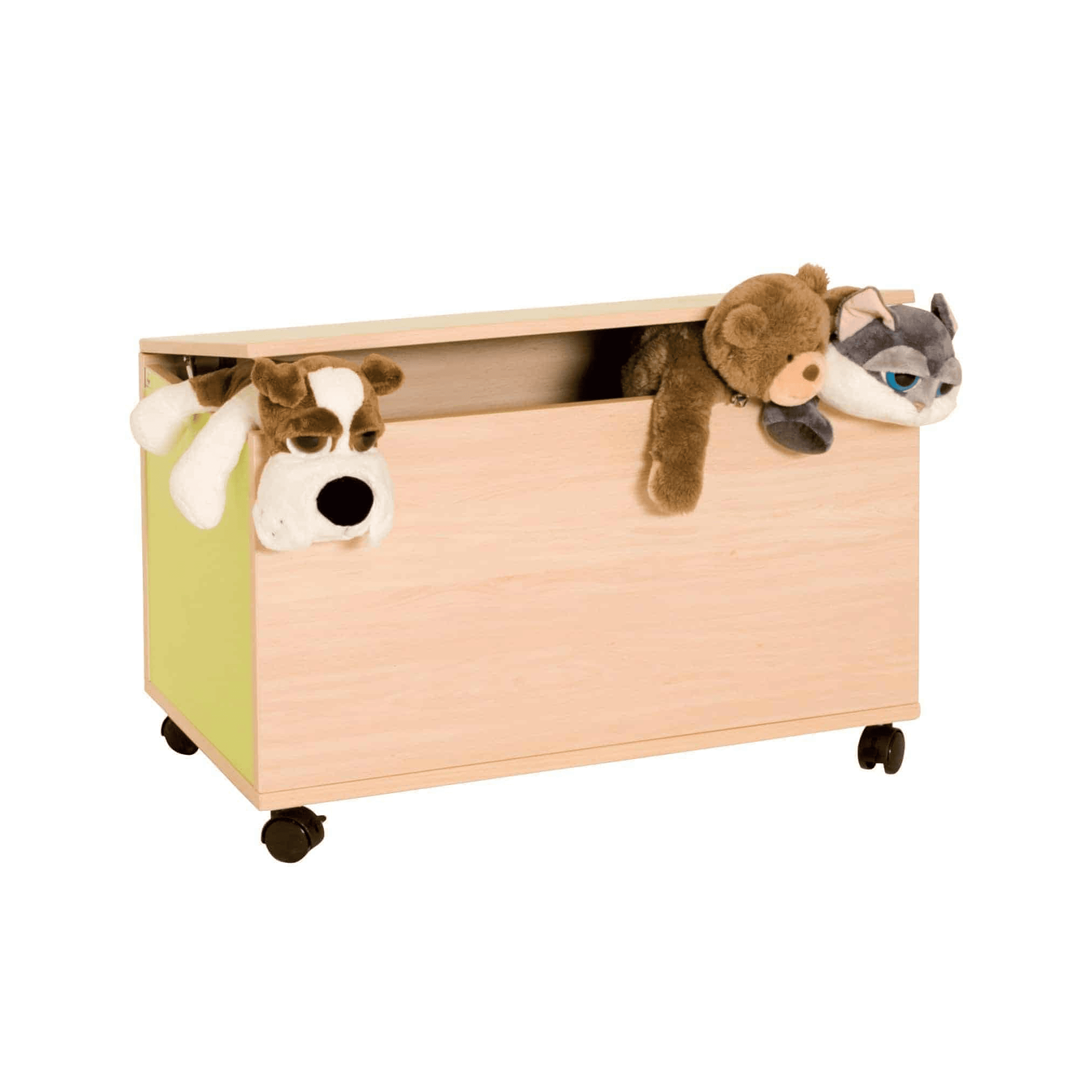 Cajón guarda juegos con sistema de cierre de tapa amortiguador. Fabricado en melamina de 19 mm de espesor y cantos de PVC de 2 mm, acabado por las dos caras. Ruedas de 6 cm con freno, para evitar la humedad y poder desplazarlo fácilmente. Disponible con patas. Bordes redondeados para la prevención de cortes o heridas.