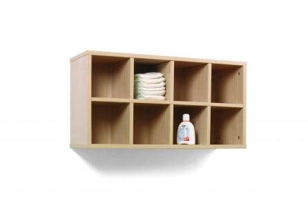 Mueble casillero con 8 casillas, fabricado en melamina de haya de 19 mm de grosor, trasera de 10 mm, separadores de casillas de 19 mm y  cantos de PVC de 2 mm, acabado por las dos caras.