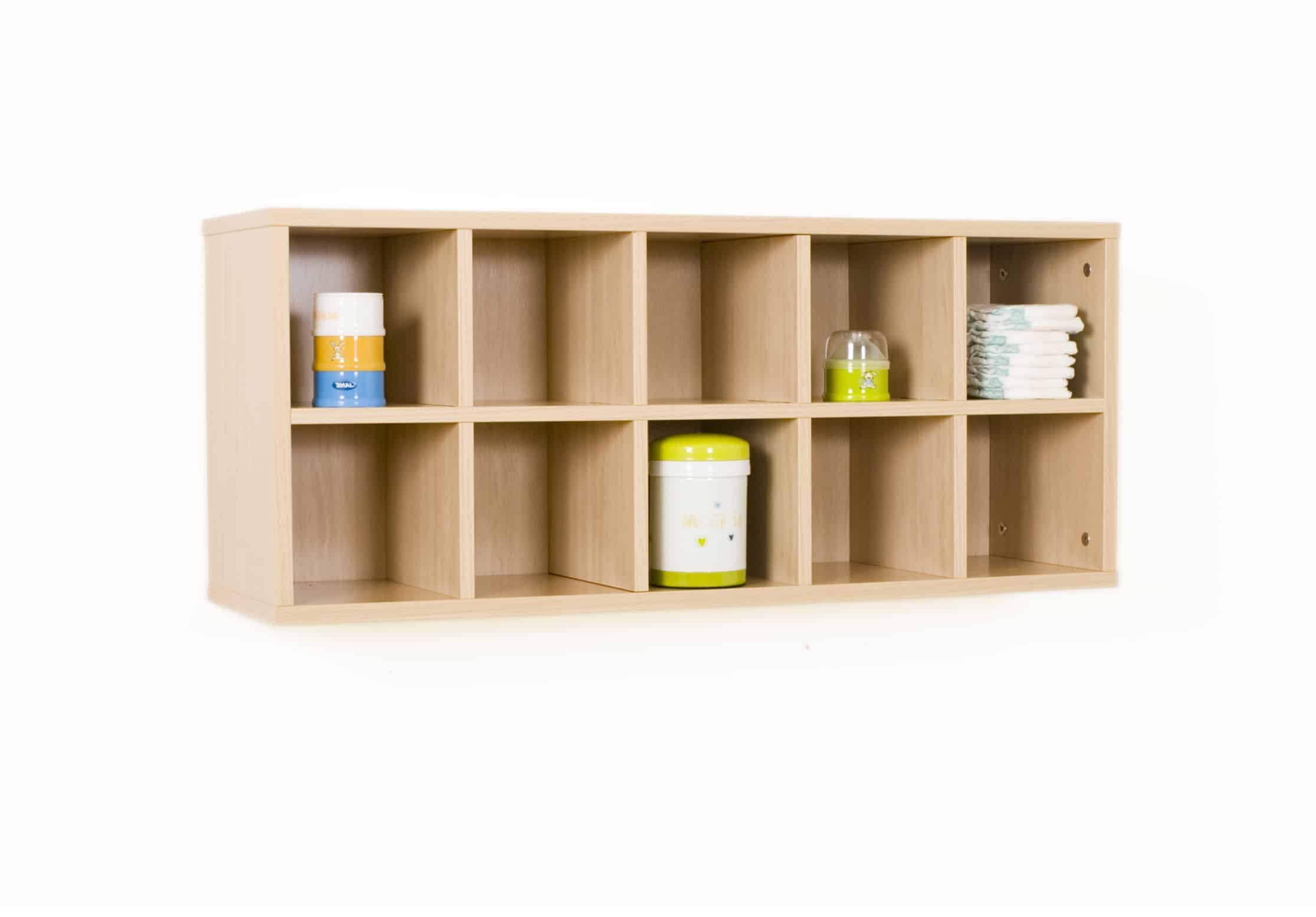 Mueble casillero con 10 casillas, fabricado en melamina de haya de 19 mm de grosor, trasera de 10 mm, separadores de casillas de 19 mm y cantos de PVC de 2 mm, acabado por las dos caras.