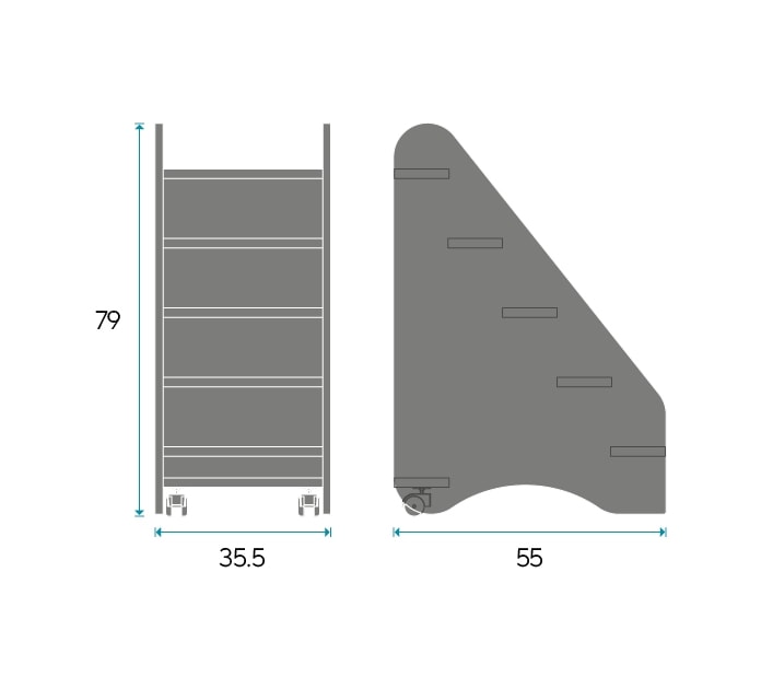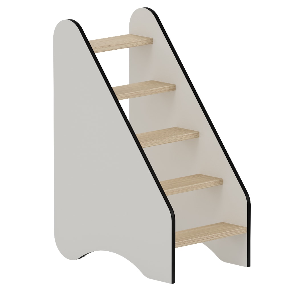 Escalera de acceso a mueble cambiador. Minimalista, robusta y con acabados neutros nórdicos, en que los colores los aporta el material escolar. Diseñada para un uso prolongado. Se entrega totalmente montada.