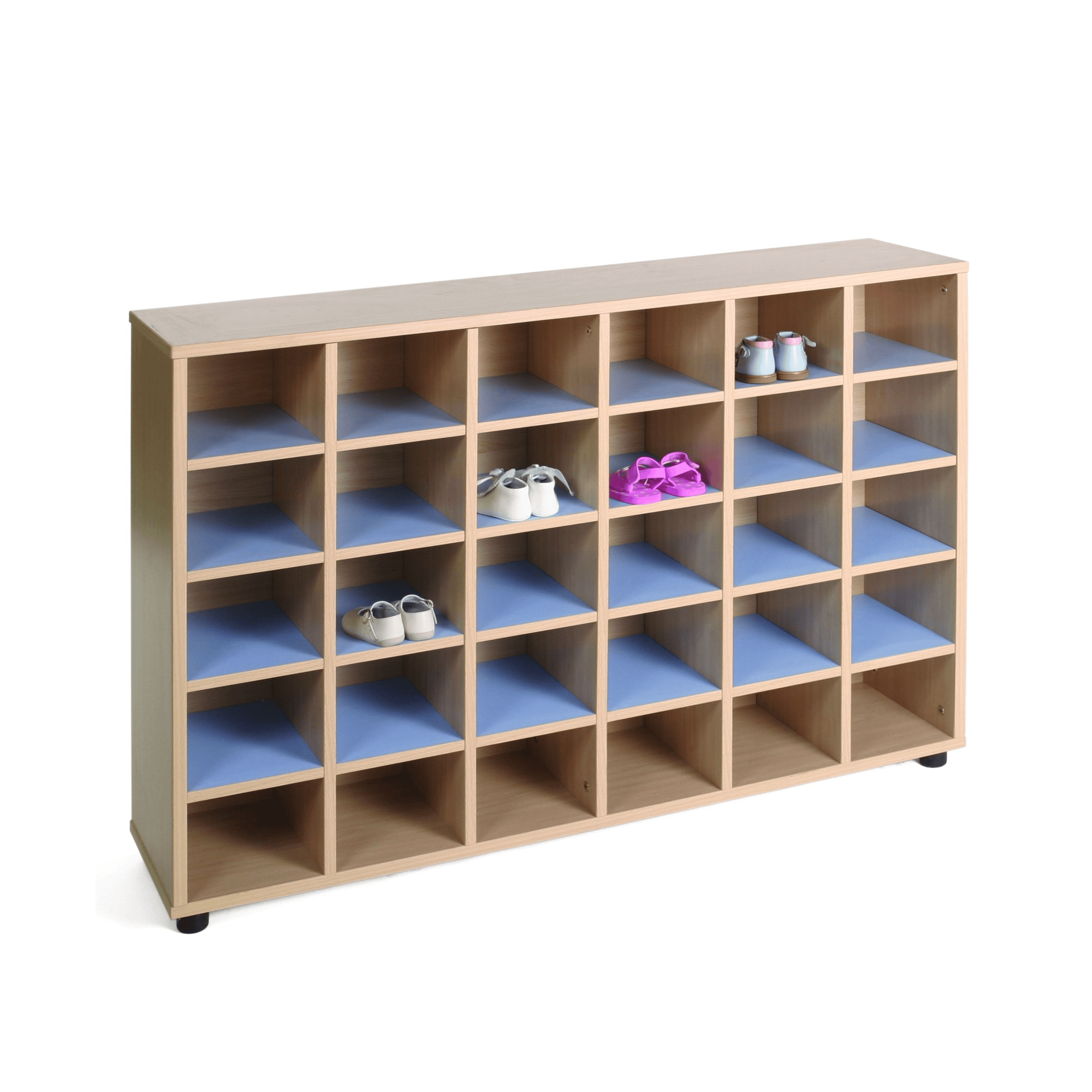 Mueble zapatero con treinta casillas, fabricado con tablero laminado en haya de 19 mm de espesor, en- samblado mediante sistema de manguitos con acer- camiento, excepto trasera de 10 mm unida por ra- nurado. Cantos de PVC de 2 mm de espesor acabados por ambas caras. Pies niveladores de PVC de Ø40 mm, regulables en alturas de 35 a 50mm, para evitar la humedad y desniveles que pueda tener el suelo.