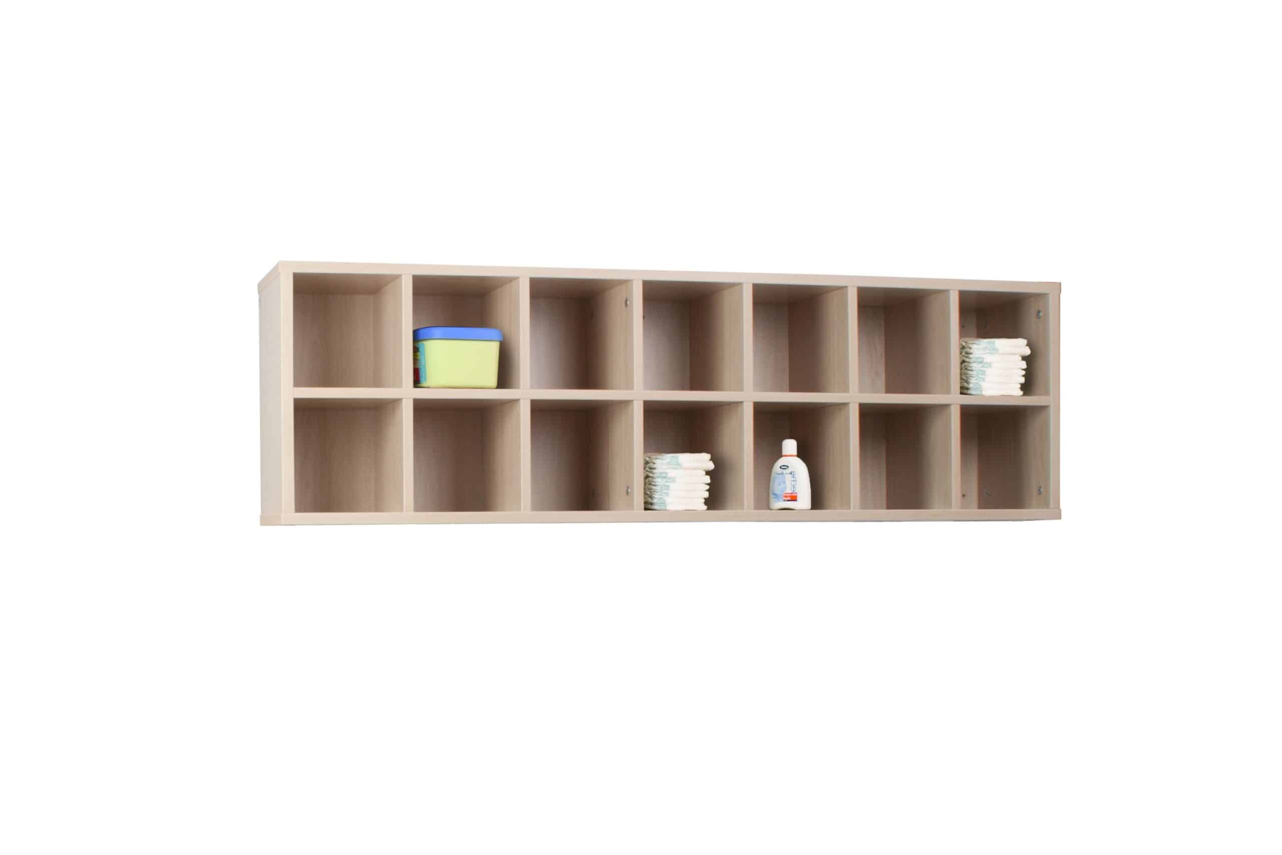 Mueble casillero con 14 casillas, fabricado en melamina de haya de 19 mm de grosor, trasera de 10 mm, separadores de casillas de 19 mm y cantos de PVC de 2 mm, acabado por las dos caras.