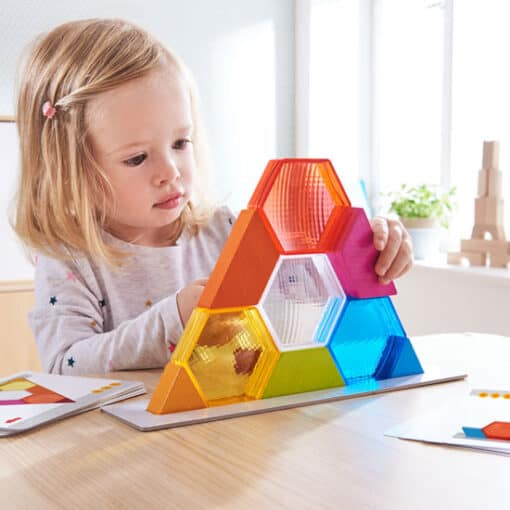 Piezas apilables para jugar de forma libre o bien siguiendo las plantillas del juego.