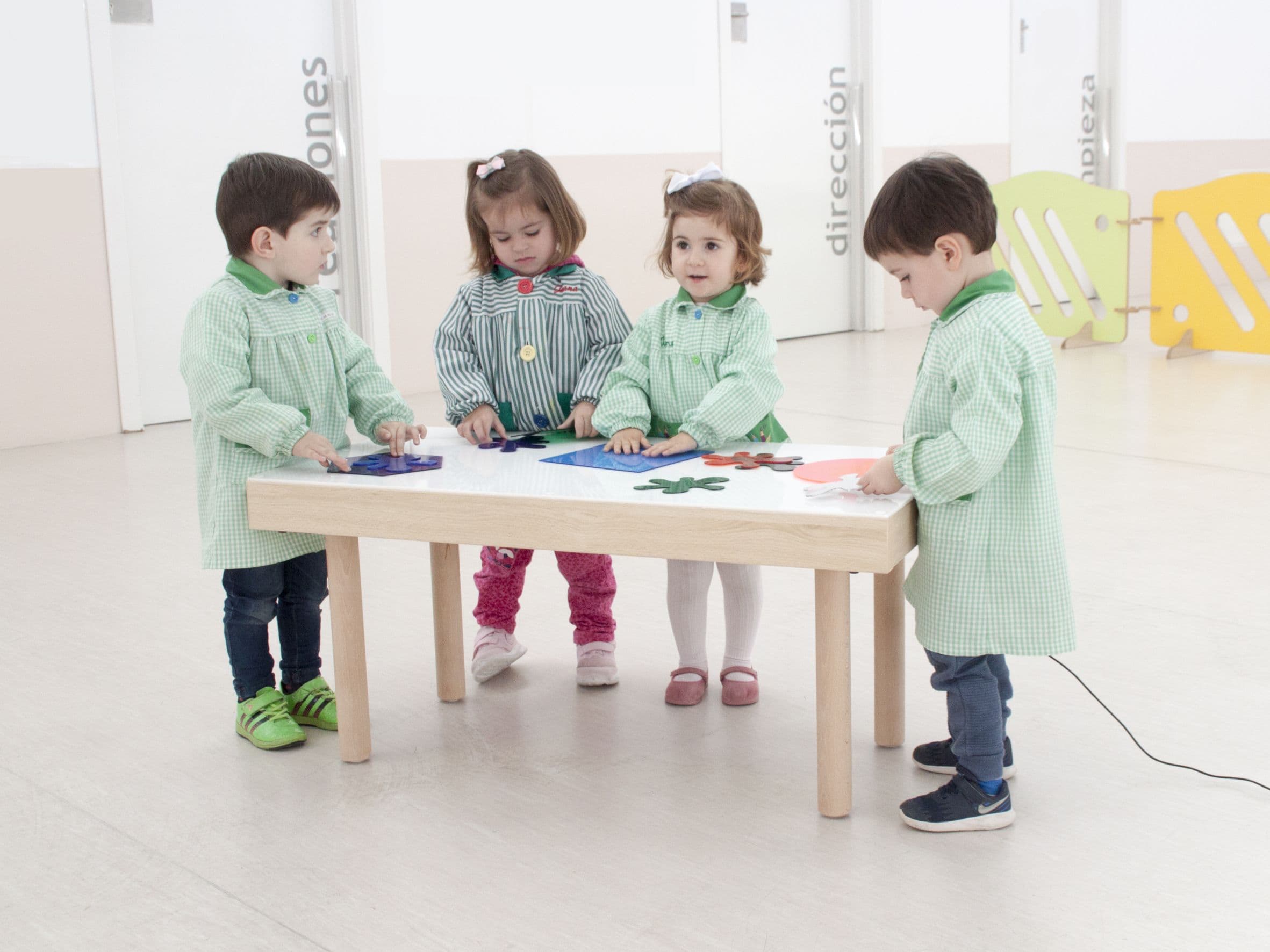 Mesa infantil rectangular compuesta por estructura en tablero bilaminado de 30 mm de grosor, canteada en PVC de 2 mm, y tapa superior de metacrilato translúcido de 5 mm de espesor. Cuatro patas de tubo metálico de sección redonda de Ø50×1,5 mm con acabado en pintura Epoxi blanco (RAL9003), ensambladas mediante sistema de roscado sobre base metálica. Incorporan conteras niveladoras para evitar los posibles desniveles que pueda tener el suelo. Disponible la opción de poner ruedas.