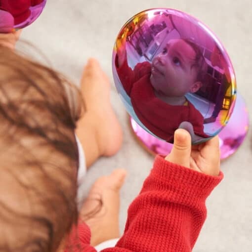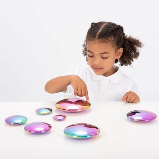 El hecho de tener una construcción metálica hace que nuestros botones reflectantes sensoriales sean muy duraderos y con una sensación de lujo. Son ligeros, suaves y convincentes al tacto. La superficie de espejo terminada a mano proporciona un reflejo ligeramente curvado y distorsionado en una variedad de colores, lo cual es fascinante para que los niños lo observen. Ideal para inspirar el lenguaje creativo, utilizar en el juego imaginativo y construir divertidas torres de apilamiento tambaleantes.