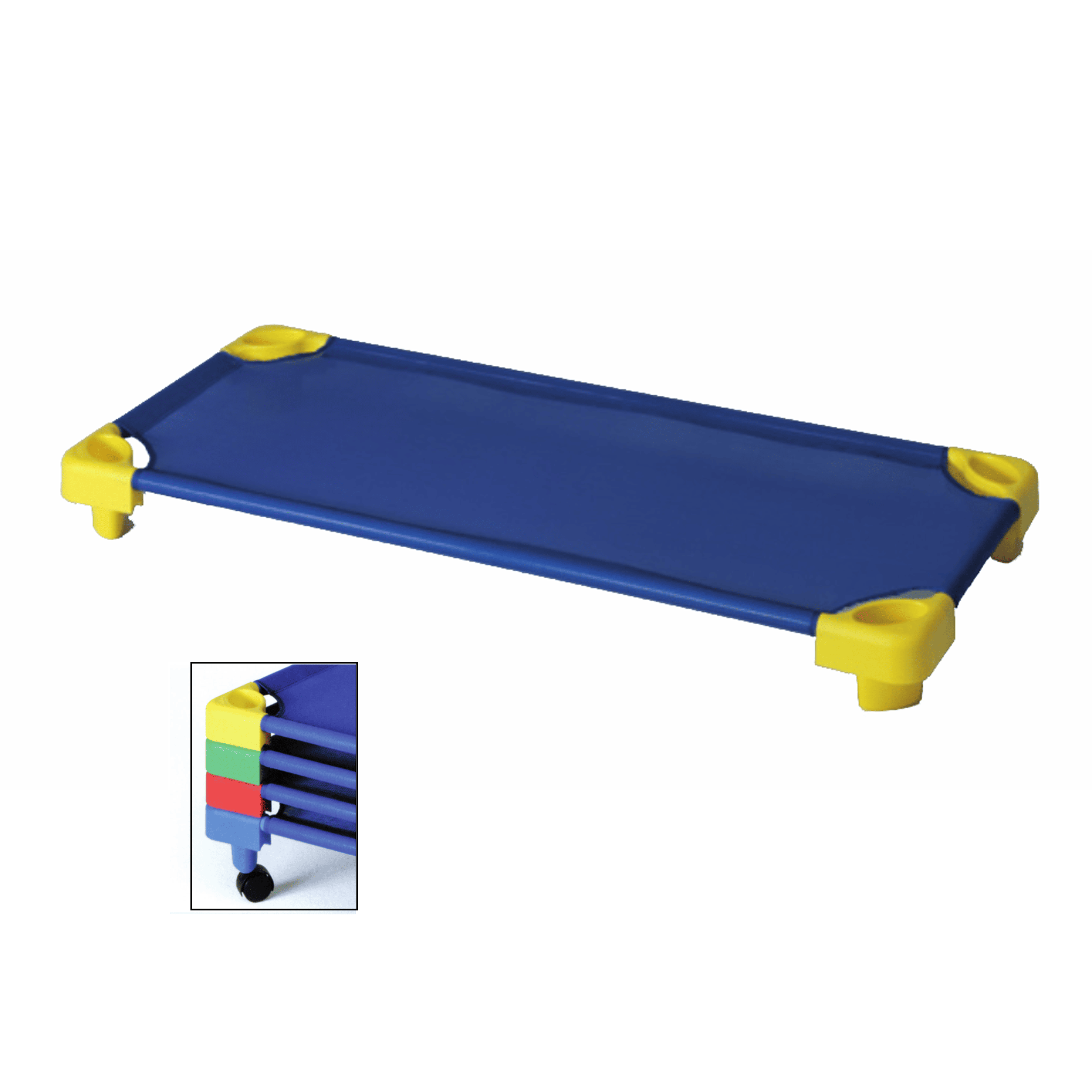 Cama apilable con 4 pies de plástico ignífugo (M2) y 4 barras metálicas de alta resistencia. Tela de nylon resistente y cómoda. Lavable. Fácil transporte mediante ruedas. Apilable