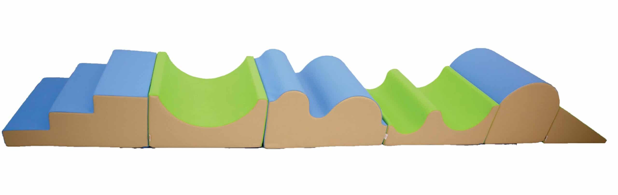 Conjunto 4 piezas: 1 escalera tres peldaños, 1 rampa, 2 piezas olas, 2 ondas curvas. Interior de espuma de 25 kg. Recubierto de PVC tacto piel. Apilable. Antideslizante.