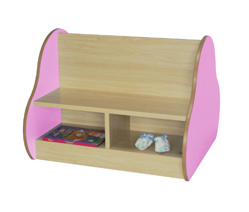 Banco a dos caras, 4 plazas con 4 huecos bajo el asiento, 2 a cada lado, para que los niños puedan guardar sus libros y juegos. Fabricado en melamina de 19 mm. de y cantos de PVC de 2 mm., acabado por las dos caras. Costados decorativos de DM de 16 mm. de con cantos redondeados y barnizados con barniz no tóxico.