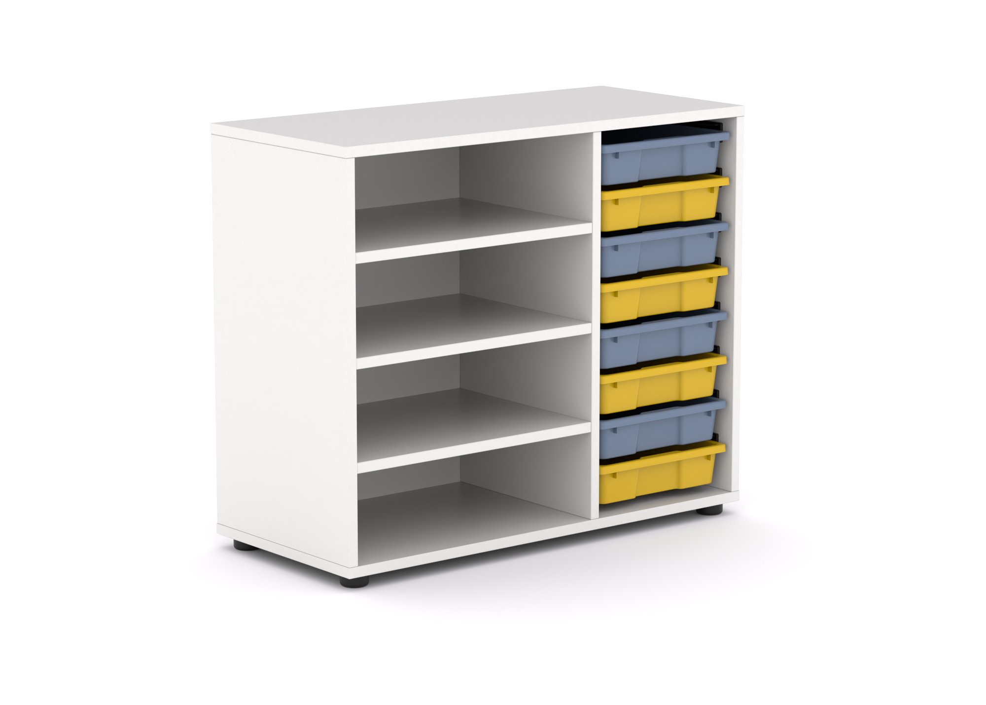 Estantería gavetero fabricado en melamina. Cuerpo de 19mm. y trasera de 8 mm. de espesor. Patas de PVC con nivelador interior. 3 estantes de 19 mm. canteado en PVC.