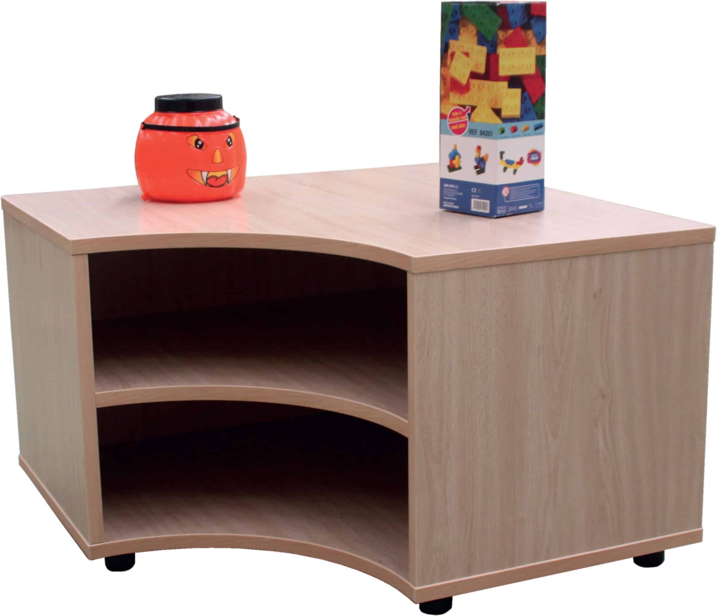 Mueble esquinero abierto 2 huecos. Fabricado en melamina de 19 mm. de , trasera de 10 mm.. Cantos de PVC de 2 mm., acabado por las dos caras. Pies niveladores de PVC de 4 cm de diámetro y 4 cm de altura, para evitar la humedad y desniveles que pueda tener el suelo. Estos pies pueden ser retirados para poder superponer diferentes armarios