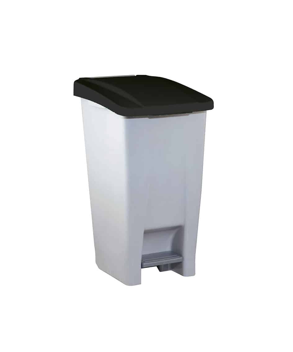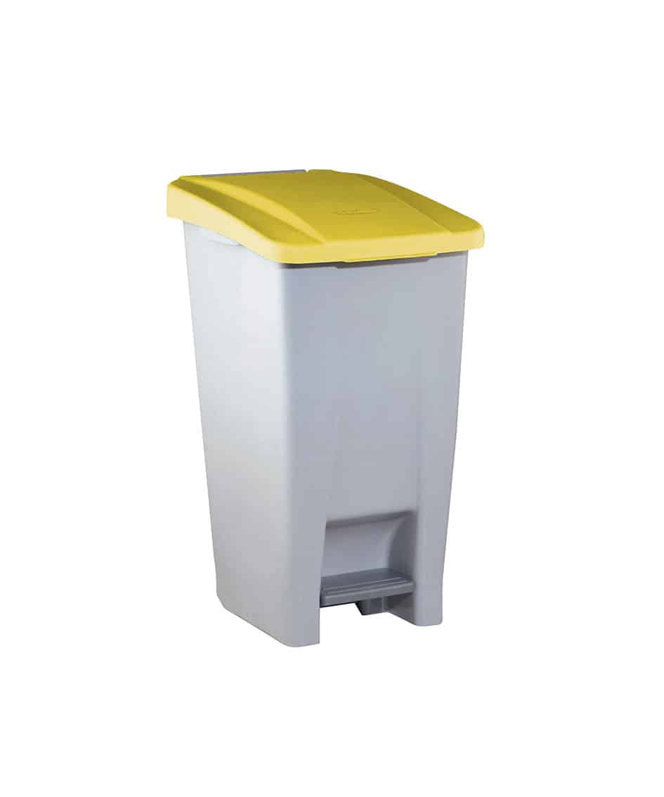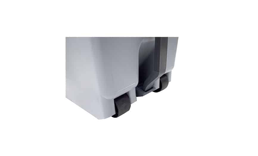 Contenedor de reciclaje con pedal, ruedas y asa trasera para facilitar su transporte.
