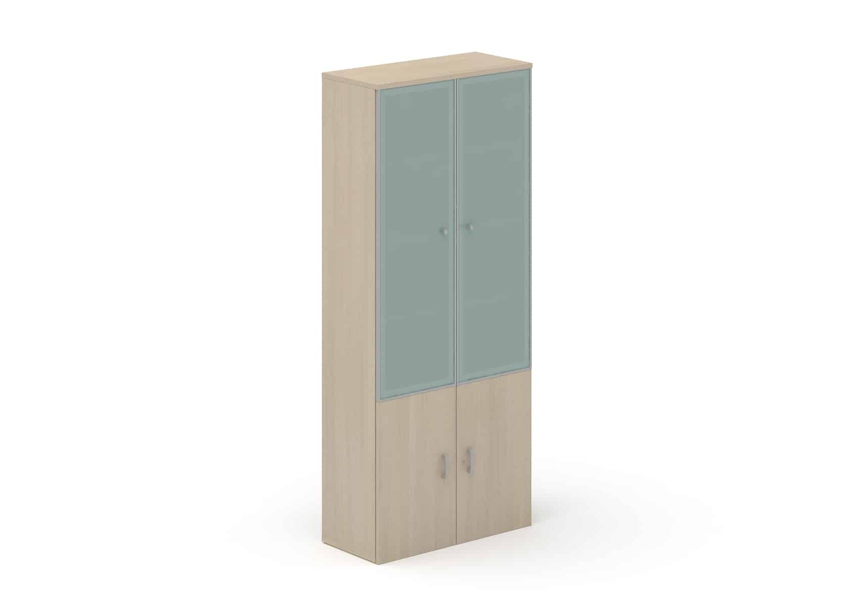 Trasera de melamina de 8 mm. O de 19 mm. y laterales de 19 mm. Estantes fijos o móviles de melamina de 25 mm. Puertas bajas de melamina de 19 mm. con cierre de falleba estándar. Opcional : – Sistema «Push Open» sin cerradura ni tirador. – Apertura 110º – Apertura 270º. Puertas altas de cristal securizado de 4 mm. Acabado en blanco, negro, translúcido o transparente.