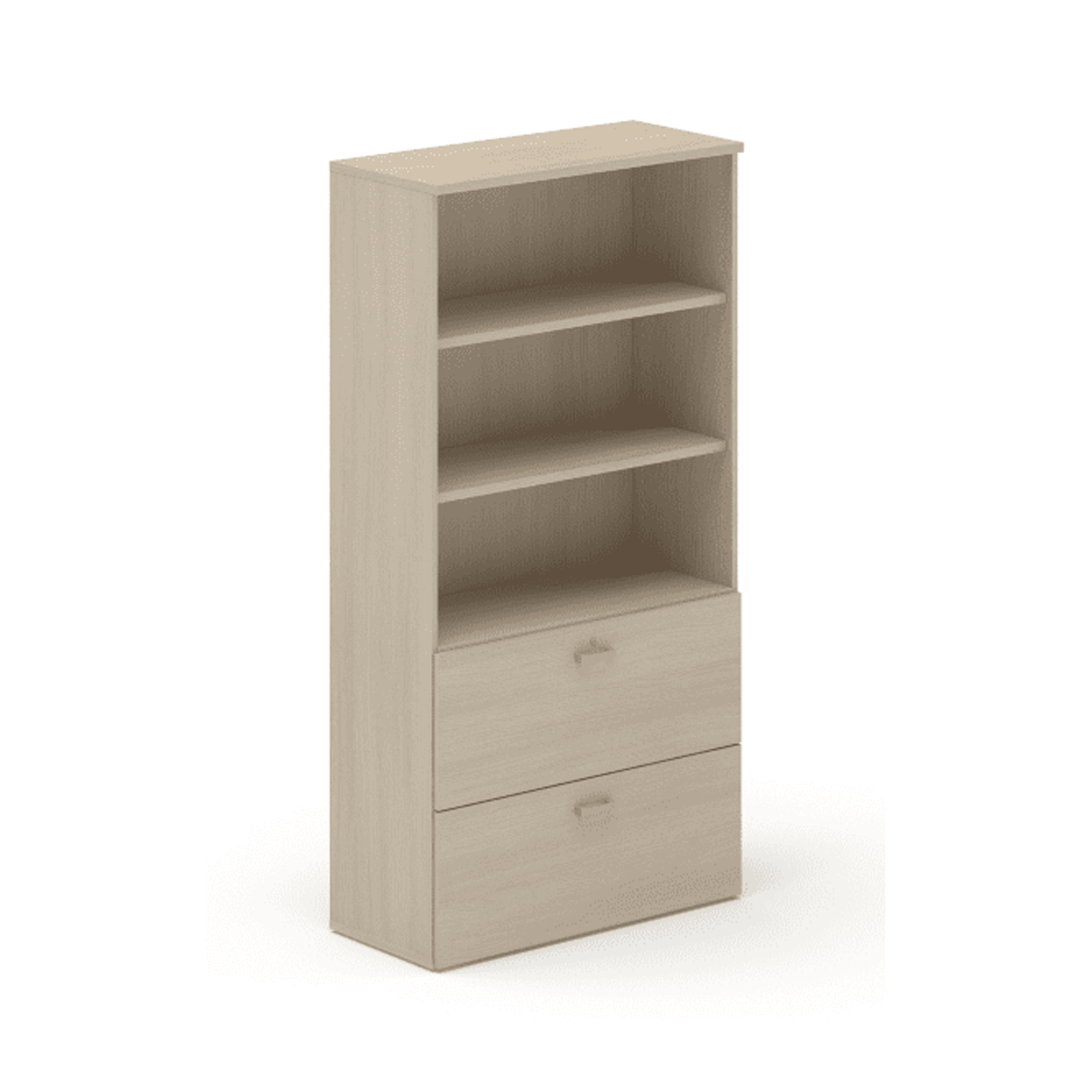 Armario melamina con estantería superior y dos cajones de archivo en la parte inferior. Disponible en diferentes alturas: 120, 158 o 196cm. Anchos posibles en medida de 60, 80, 100 y 120cm. Fondo de 41,9cm. Diferentes opciones de acabado.