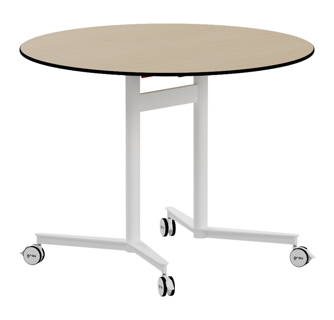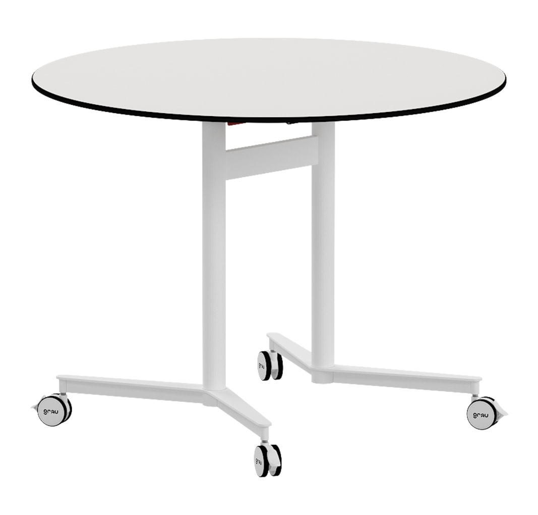 Mesa redonda abatible. Fabricada con estructura metálica soldada de tubo ø30×1,5 mm que le proporciona una gran solidez, pintada con epoxy blanco microtexturado RAL 9010.