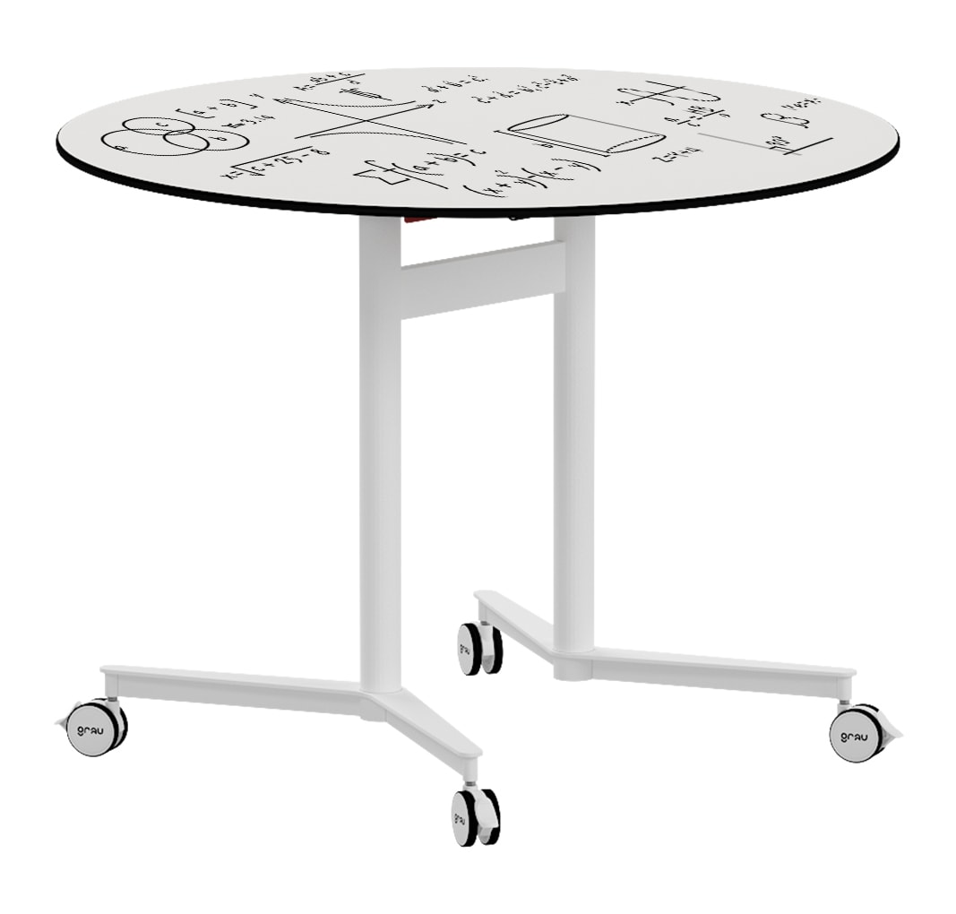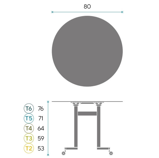 Disponible en 4 tipos de tableto: CDF Blanco de 16,4 mm (compuesto de fibras de densidad compacta), Fenólico blanco o Nórdico de 12 mm (resina fenólica hidrófuga de alta densidad), y compacto rotulable. Disponible en 5 alturas T2-T3-T4-T5-T6. Medidas: Diametro 80 cm y 100 cm.