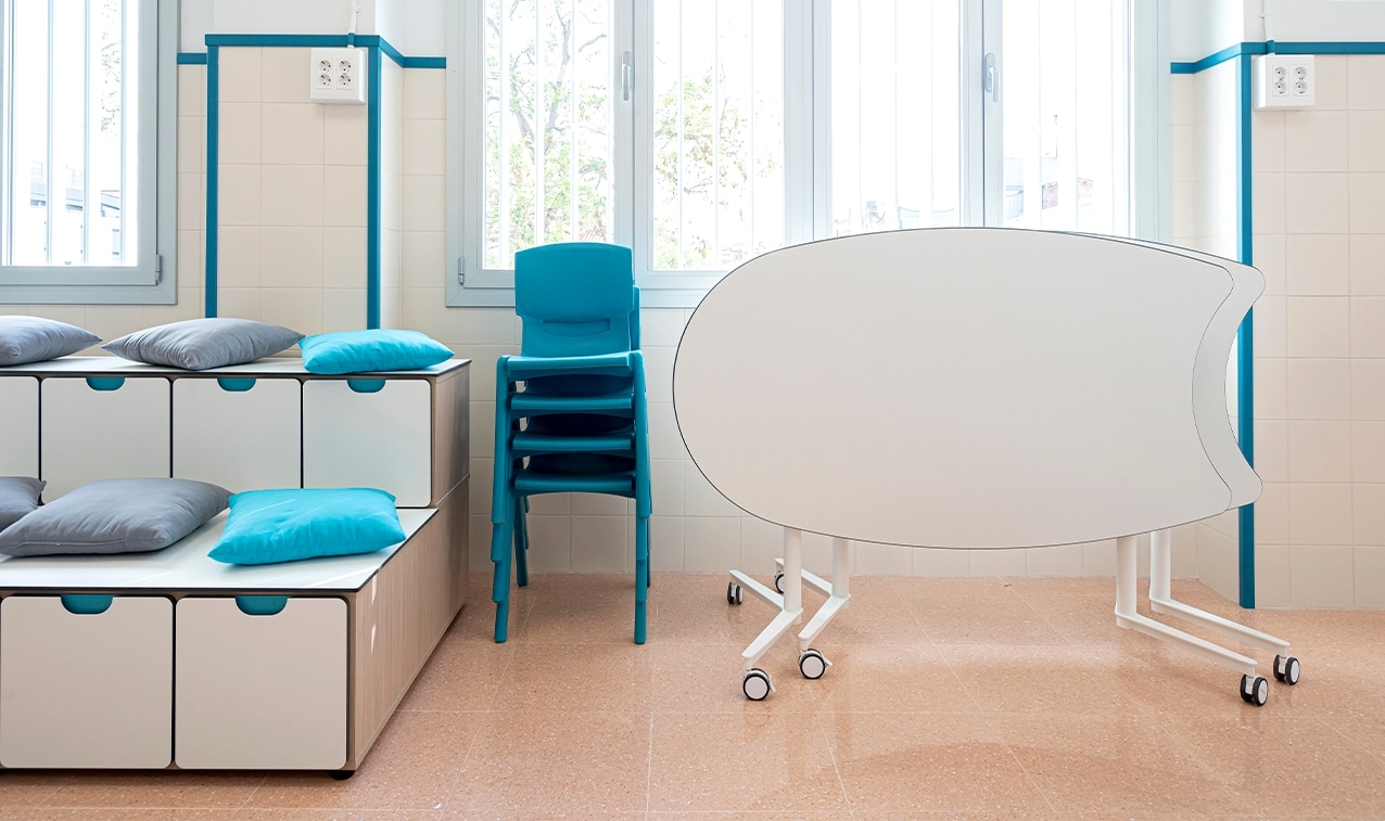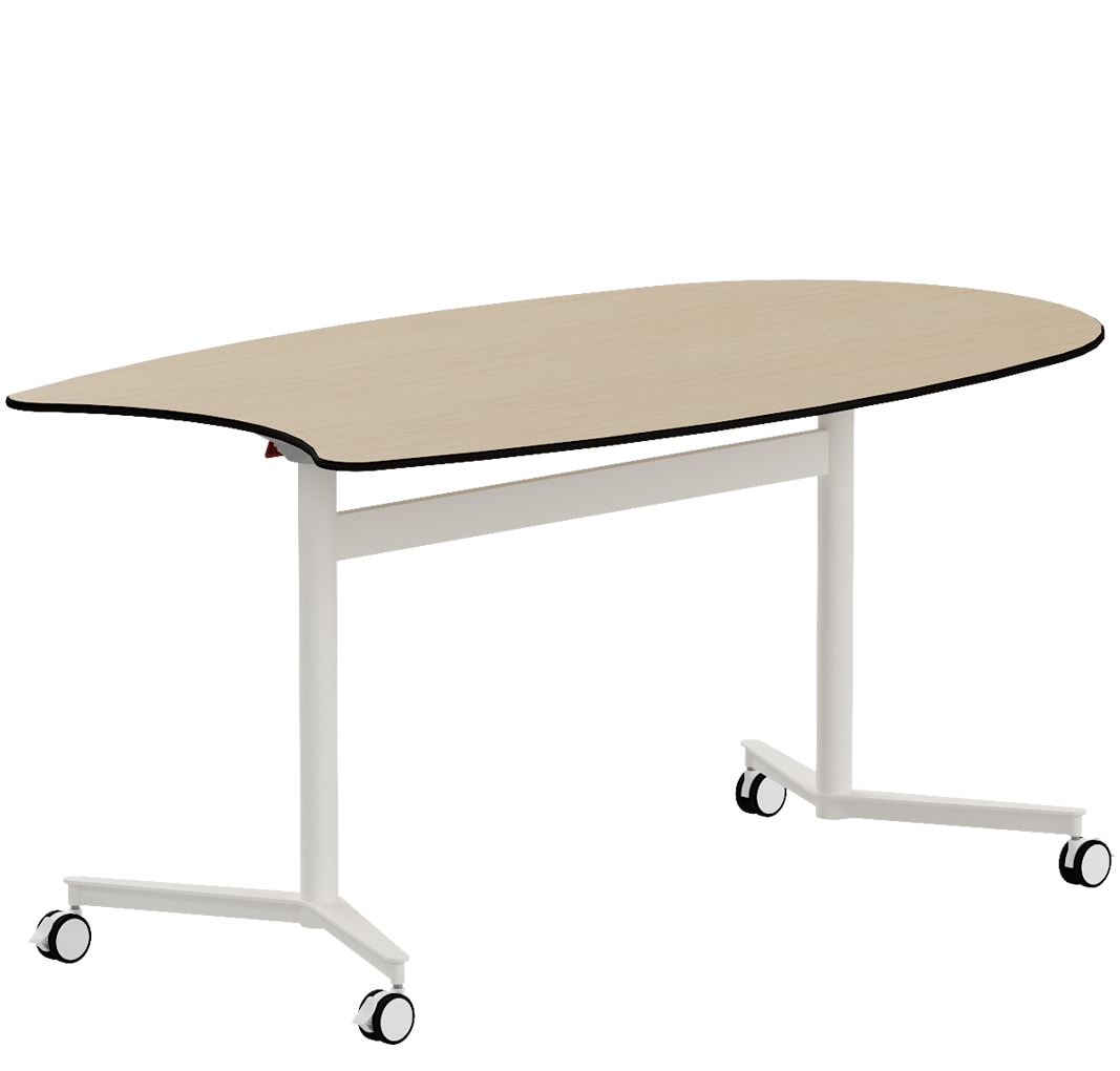 Mesa abatible con ruedas y freno, fabricada con estructura metálica soldada que le proporciona una gran solidez, pintada en epoxy blanco microtexturado RAL 9010.