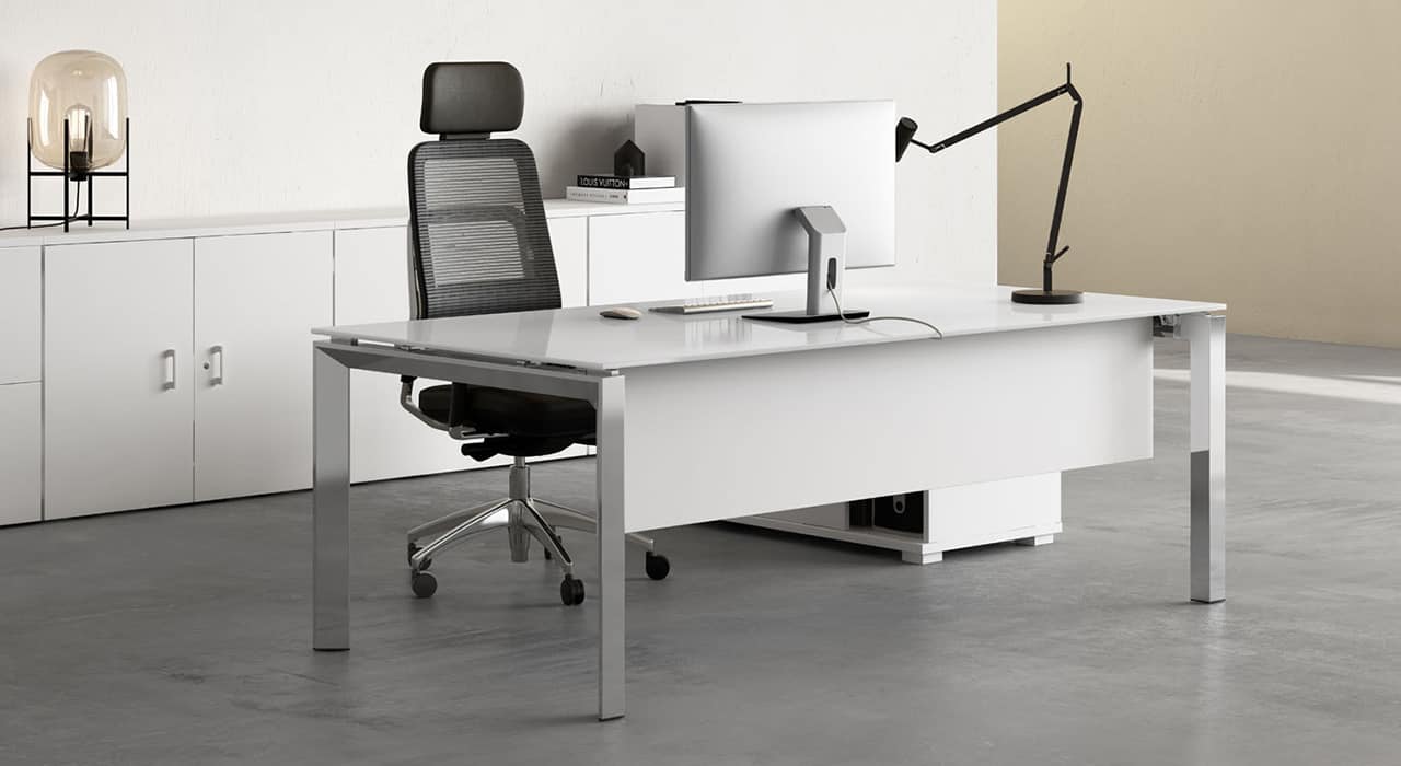 Mesa de trabajo para despachos. Sobre opcional: melamina de 25 mm, estratificado de 25 mm. Fenólico de 13 mm. HDF de 12 mm. o vidrio de 10 mm. Laterales abiertos con perfiles de acero en forma triangular fabricados a partir de una sola pieza en forma de u invertida. Laterales cerrados: Realizados con tubos de acero de 50 x 50 x 1.5 mm. Soldados mediante soldadura mig. Acabados con pintura epoxi Ral 9006 (plata), Ral 9016 (blanco) y Ral 7022 (grafito).