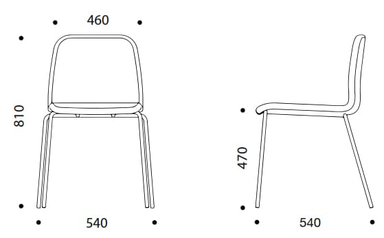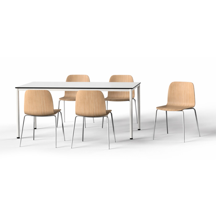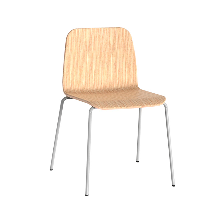 Silla Fly, asiento monocarcasa de madera contrachapada postformada ergonómicamente y hoja vista en estratificado de color madera disponible en tono: roble o roble oscuro o chapa natural de haya barnizada. Cantos barnizados y suaves. Estructura metálica de 4 patas fabricada en tubo de acero de Ø16 mm. pintado en epoxy. Altura disponible T6. Opcional: brazos
