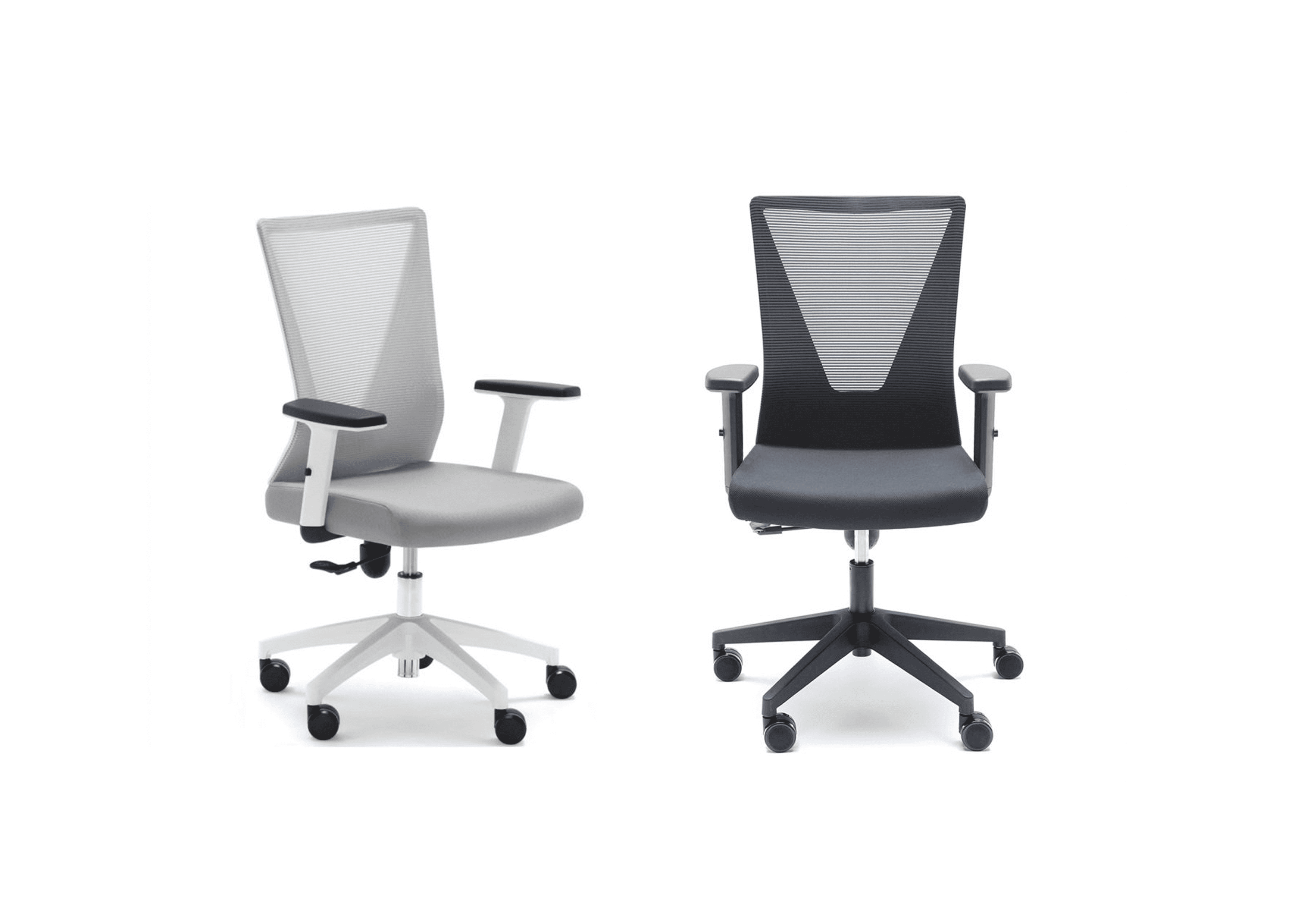 Opción de color blanco/gris o negro. Respaldo en malla efecto tela de alta resistencia y elasticidad. Asiento tapizado en tela flex y goma espuma de alta densidad. Mecanismo contacto permanente liberado Tensor de control de presión. Brazos regulables 1D con reposa brazos de goma. Base piramidal de nylon y fibra vidrio, 63 cm de diámetro y 5 radios Ruedas de 60 mm de diámetro en nylon negro.