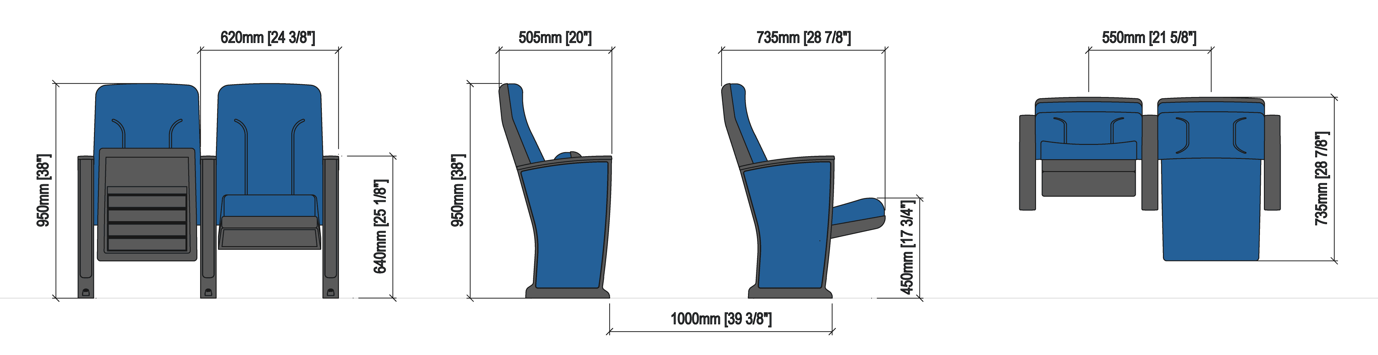 Butaca acolchada, ergonómica, con suaves líneas depuradas en todos sus contornos, sin aristas ni esquinas. Ideal para auditorios, espacios deportivos, salas de usos múltiples, universidades, centros culturales, centros de congresos, salones de actos, etc. Respaldo: sistema de tapizado “UNIBLOCK 2 ®” de molde en frío de espuma de poliuretano que envuelve completamente un bastidor de inyección de polipropileno todo ello protegido con una carcasa de inyección de polipropileno texturizado. Asiento: sistema de tapizado “UNIBLOCK 2 ®” de molde en frío de espuma de poliuretano que envuelve completamente un bastidor de inyección de polipropileno. El plegado del asiento se produce mediante doble resorte de forma automática y silenciosa. Costado: inyección de polipropileno texturizado. Brazo: inyección de polipropileno texturizado. Dimensiones: 55 a 57 cm ancho entre ejes, 50.5 cm largo, 95 cm alto.
