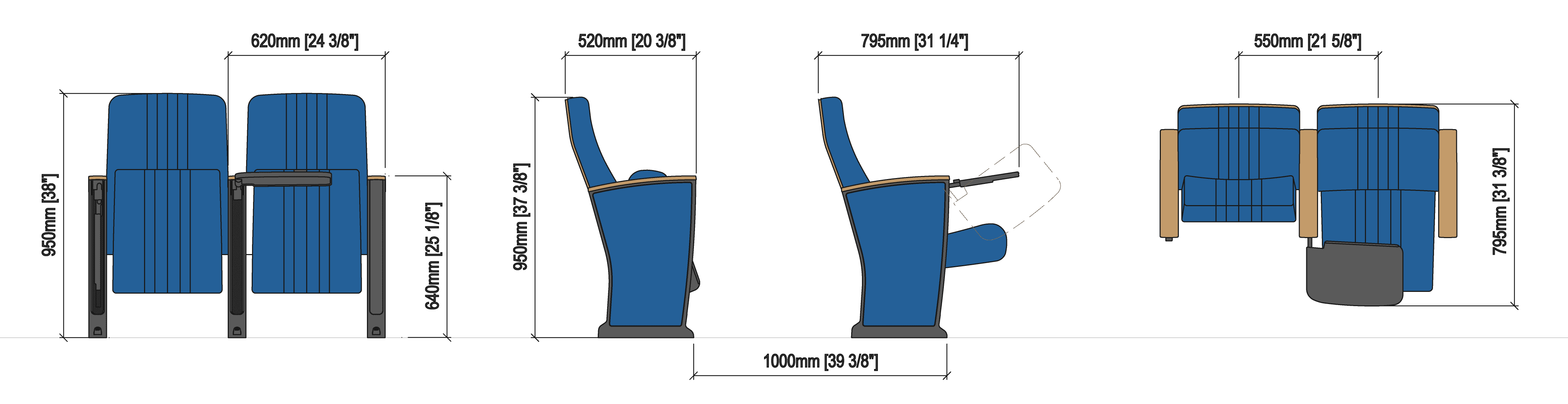 Butaca confortable y versátil, tanto en acabados como en espacios colectivos, donde sobresale como la protagonista de auditorios, salas de conferencias, palacios de congresos, teatros… Respaldo: espuma de poliuretano moldeada en frío, que envuelve completamente un bastidor de inyección de polipropileno, tapizado posterior mediante funda de tejido, todo ello protegido por una trasera de laminado 3D mediante sistema LYF. Asiento: espuma de poliuretano moldeada en frio, que envuelve completamente un bastidor de inyección de polipropileno, tapizado posterior mediante funda de tejido. El plegado del asiento se produce mediante doble resorte de forma automática y silenciosa. Costado: inyección de polipropileno texturizado. Sistema de pala de escritura antipánico de poliestireno estructura interior metálica, alojado en el interior del costado. Tapas final de fila con acabado laminado 3D mediante sistema LYF. Brazo: inyección de polipropileno texturizado, de forma rectangular. Dimensiones: 55 a 57 cm ancho entre ejes, 52 cm largo, 95 cm alto.