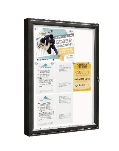 Enmarcada con perfl de aluminio anodizado o pintado de 58 mm. de espesor. Puertas de una hoja batiente reversible o levadiza asistida con amortiguadores para medidas grandes. Acristalamiento Plexichocs o vidrio de 4 mm. de espesor. Fijación a pared o sobre postes. Fondo en chapa galvanizada lacado en blanco. Junta de estanqueidadde elastómero. Cerradura de seguridad (2 cerraduras para puerta batientes de altura 135 y puertas levadizas).