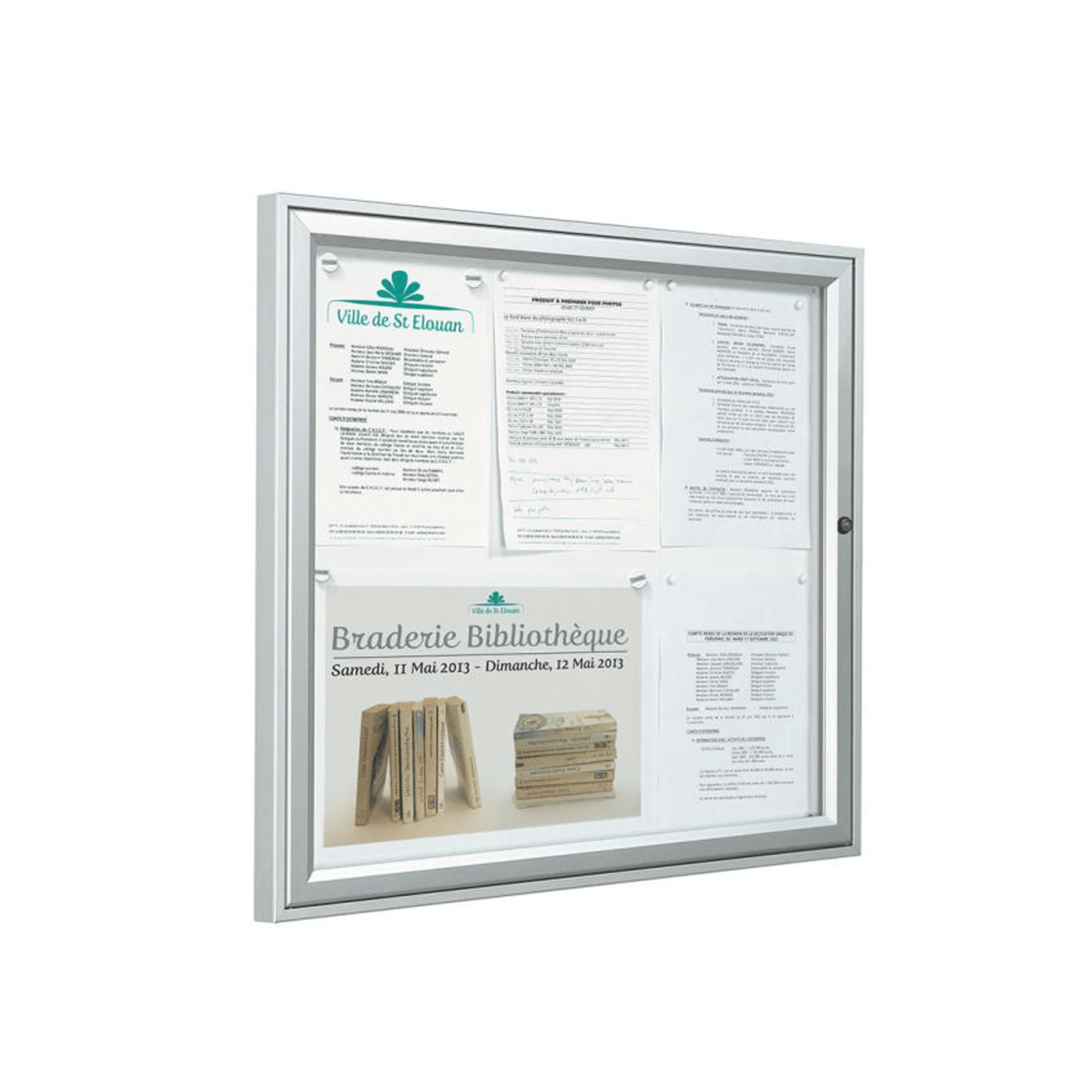 Enmarcada con perfil de aluminio anodizado o pintado de 30 mm. de espesor. Puertas de una hoja batiente reversible o de dos hojas. Acristalamiento Plexichocs de 4 mm. de espesor. Fijación a pared o sobre postes. Fondo en chapa galvanizada lacado en blanco. Junta de estanqueidad de elastómero. Cerradura de seguridad con 2 llaves.
